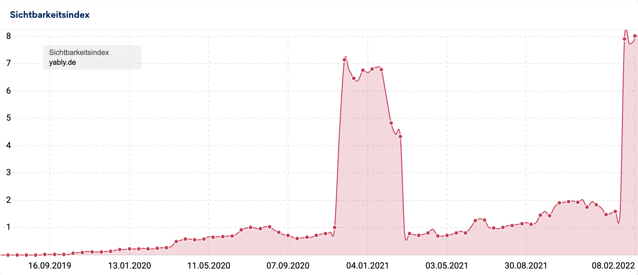 Sieht man sich die Sichtbarkeitsentwicklung der letzten 2 Jahre an, fällt allerdings auf, dass es vor ziemlich genau 12 Monaten schon einmal zu einem massiven Sichtbarkeitszuwachs kam, der jedoch nur zwei Monate hielt. Es bleibt also abzuwarten, wie nachhaltig die Entwicklung ist.