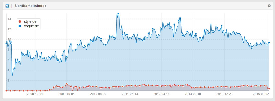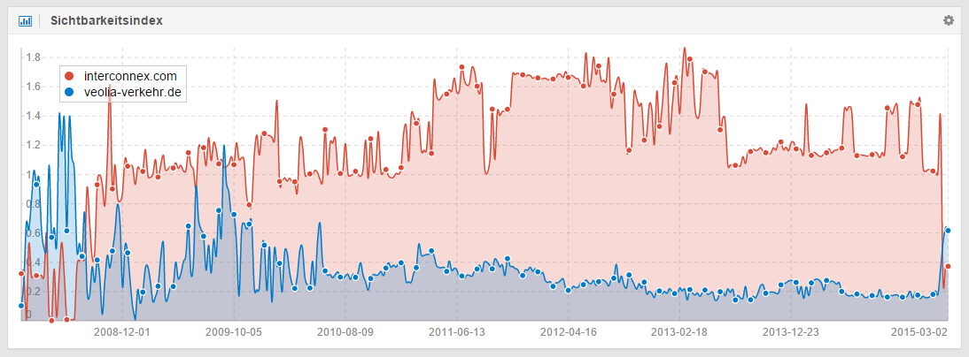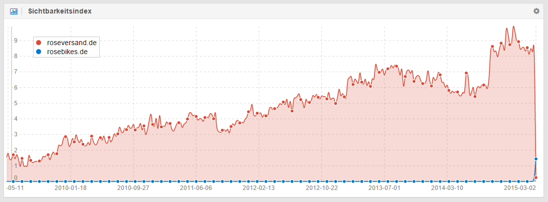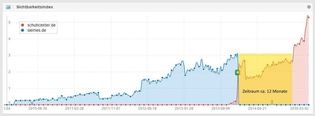 Ende 2013 wurde aus der Domain siemes.de die heutige Domain schuhcenter.de. Anhand der beiden Sichtbarkeitsindizes im Vergleich ist sowohl der Zeitpunkt des Domainumzuges, als auch der benötigte Zeitraum erkennbar, um wenigstens an den damaligen Höchstwert von knapp drei Punkten im Sichtbarkeitsindex anzuknüpfen.