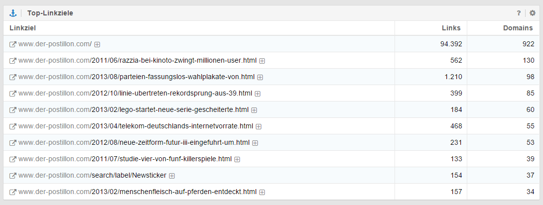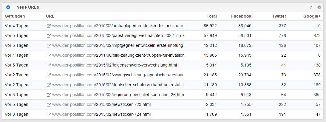 Noch eindrucksvoller als die Top-Linkziele sind die sozialen Signale der Domain. Hier ein kleiner Auszug aus den neuen URLs der vergangenen Tage: