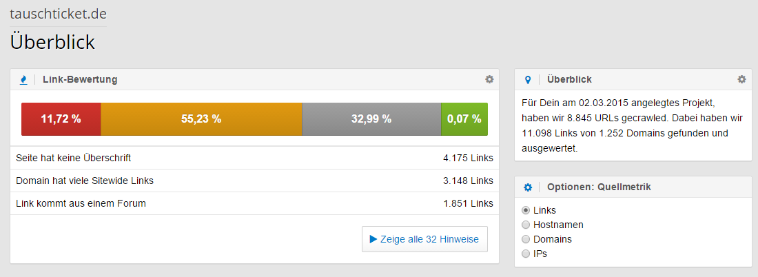 Ist das Backlink-Profil der Domain schuld an der vermeintlichen Abstrafung? Auf Basis unserer Linkdaten habe ich mir die Backlink-Qualität mittels LinkRating bewerten lassen.