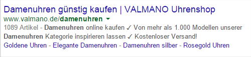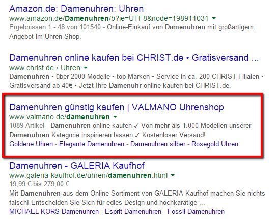 Was macht der Onlineshop also richtig? Die interne Verlinkung wurde z.B. gut eingesetzt und entpsrechend gesteuert. Das SERP-Snippet zum Keyword [damenuhren] animiert zum Klicken.