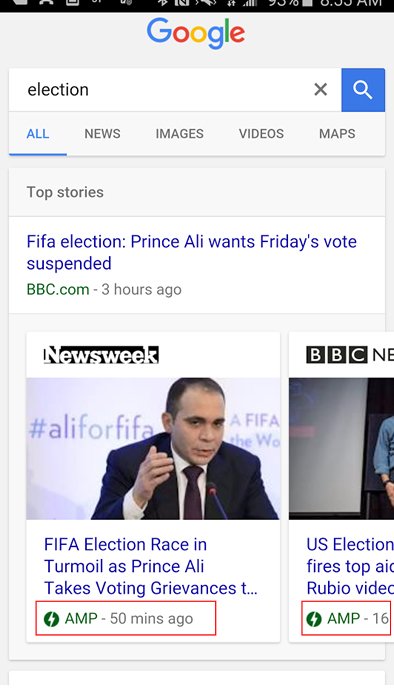 „AMP“ ist die Kurzversion für „Accelerated Mobile Pages“ und soll das schnelle Laden mobiler Websites auch bei sehr langsamen Datenverbindungen ermöglichen. AMP ist ein Open-Source Projekt von Google und Twitter. Eine Website die AMP nutzt, besteht aus vereinfachten CSS-Regeln und nahezu keinen dynamischen Inhalten, da die reguläre JavaScript-Funktionalität entfernt wird. Somit wird die Quellcodegröße drastisch reduzierte und die zu ladenden Ressourcen auf ein Minimum beschränkt. Google speichert alle AMP-Seiten auf lokalen Caching-Servern, um den anfragenden Clients den kürzesten Abrufweg zu ermöglichen. Die ersten Websites, welche AMP unterstützen, wurden jetzt in der mobilen Suche bei Google in einem News-Carousel optisch ausgezeichnet (Bild).