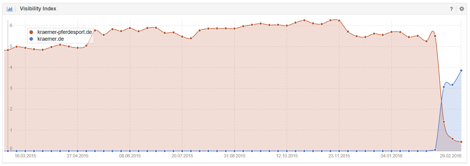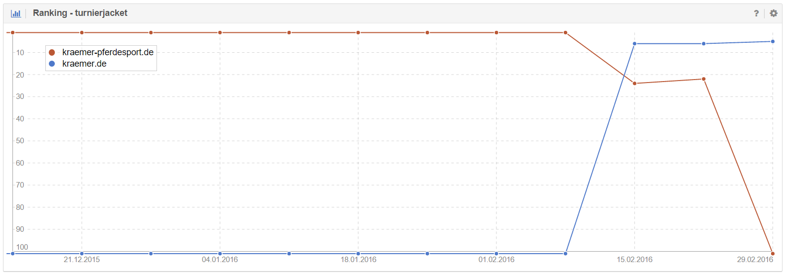 Der Umzug von kraemer-pferdesport.de zu kraemer.de scheint gut zu funktionieren. Anhand der exemplarischen Ranking-Entwicklung zum Keyword [turnierjacket] ist ein Wechsel der rankenden Domain gut zu erkennen.