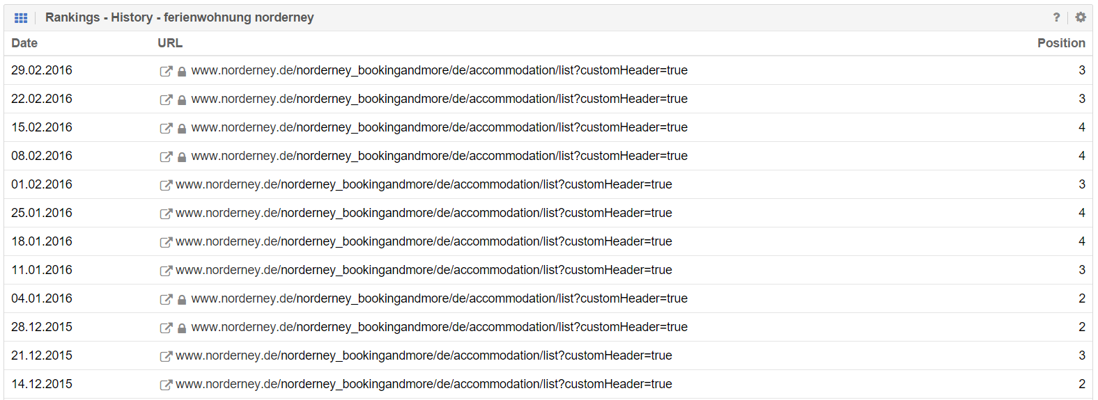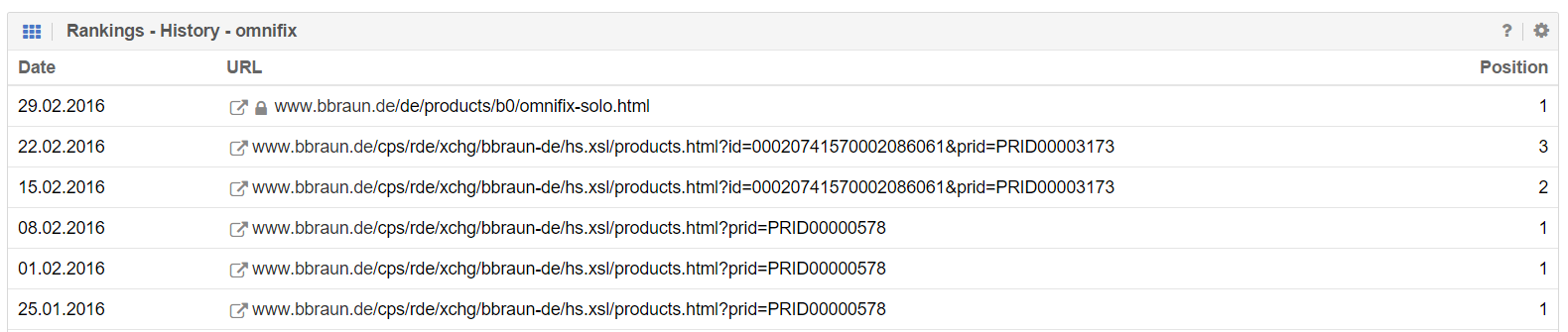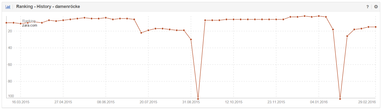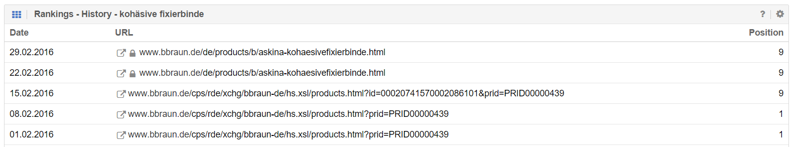 Eine stabil rankende URL wird auf den Suchergebnisseiten durch eine URL aus dem /sale/-Verzeichnis getauscht. Darauf fällt die Rankingposition um ganze zwei bis drei Seiten, bis nach einigen Wochen wieder die „alte“ UR zurückkehrt. In der Vergangenheit ist dies schon einmal vorgekommen, wie man anhand der unteren Tabelle im Rankingverlauf sehen kann.