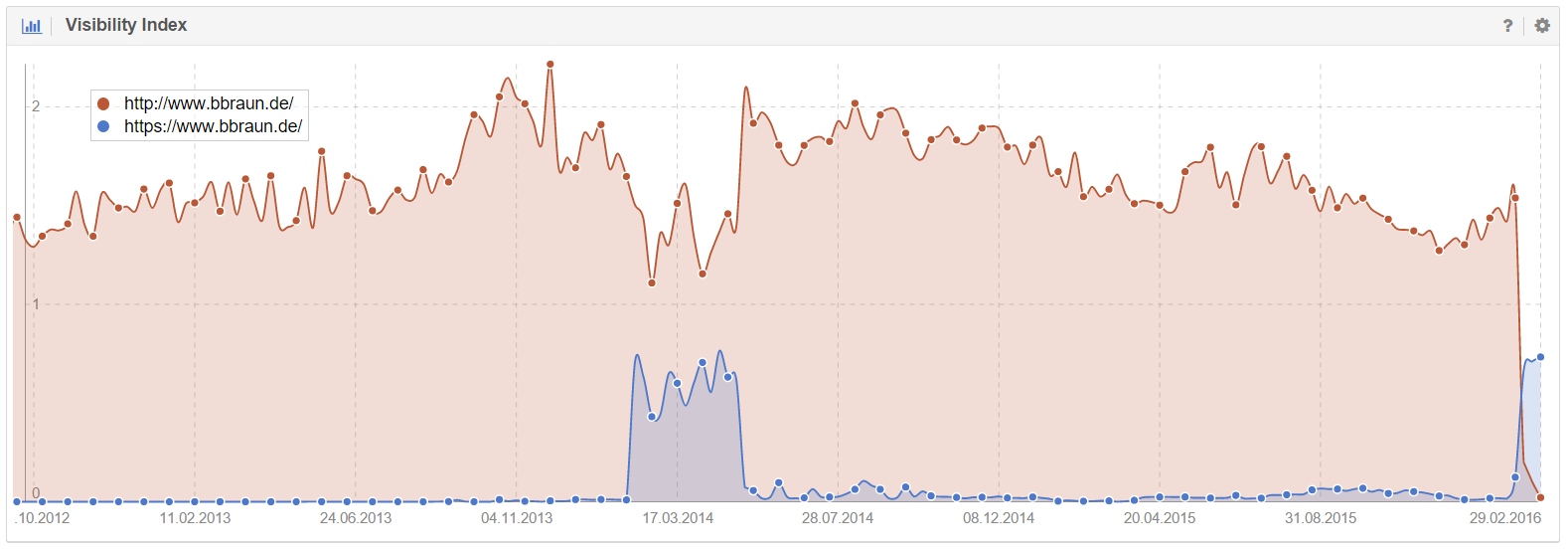 Anhand des Sichtbarkeitsindex ist sogar zu erkennen, dass die Rankings der Domain bereits im Jahr 2014 kurzzeitig auf der HTTPS-Version des Inhalts verweisen. Ob dies damals lediglich ein Versehen war oder man die Umstellung aufgrund technischer Fehler zurücknehmen musste, kann nur spekuliert werden.