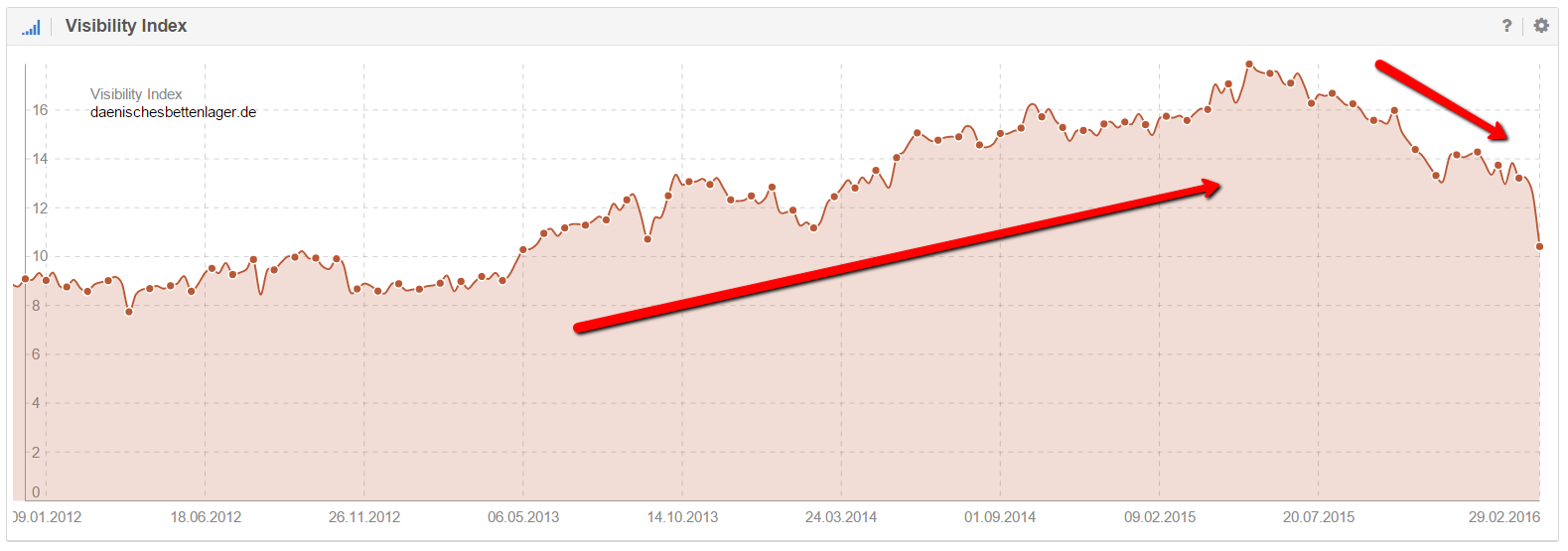 Das DÄNISCHES BETTENLAGER ist nach eigenen Angaben eines der führenden Handelsunternehmen für Matratzen, Oberbetten, Kissen, Möbel, Einrichtungsgegenstände und Wohnaccessoires in Europa. Der Sichtbarkeitsindex der Domain konnte seit dem Jahr 2013 einen nachhaltigen Aufwärtstrend aufweisen, welcher sich leider inmitten des vergangenen Jahres in einen scheinbar kurz- bis mittelfristigen Abwärtstrend umwandelte.