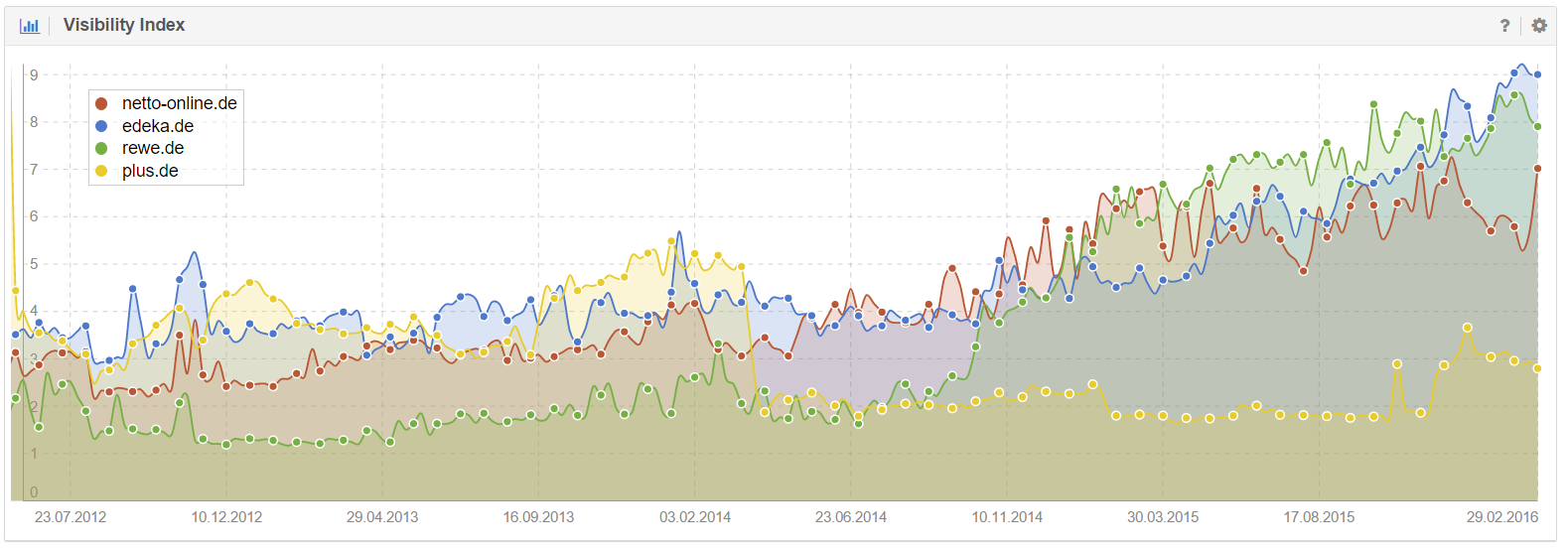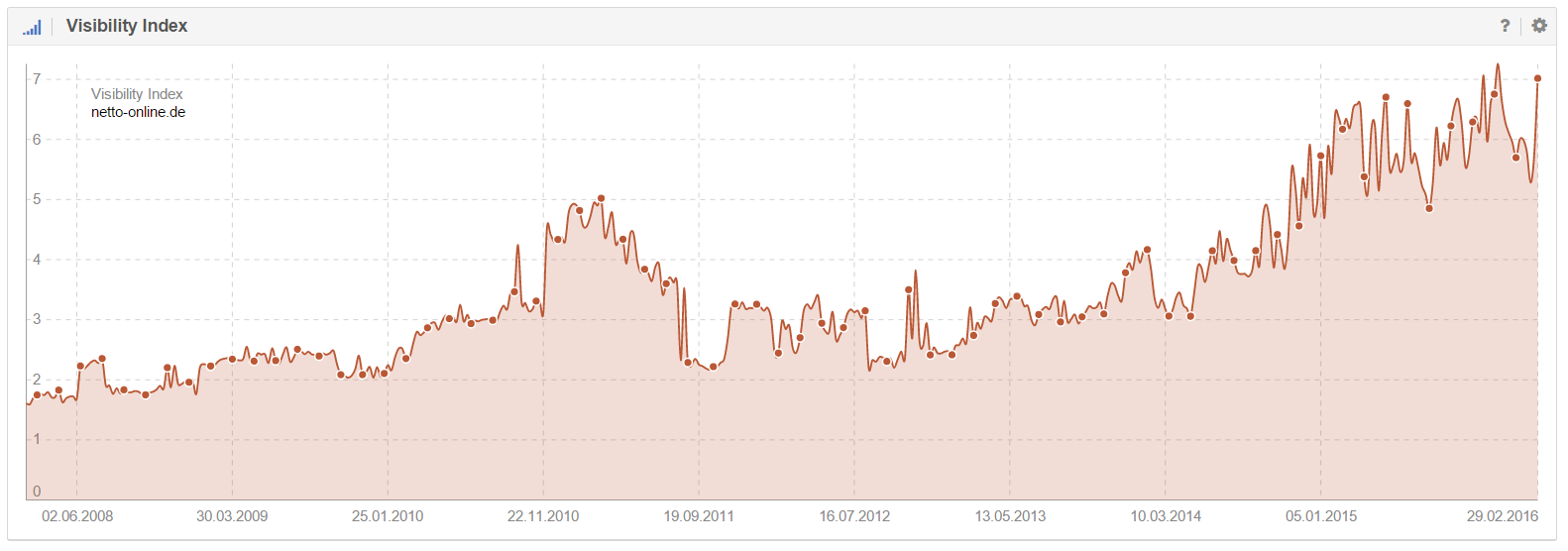 Ich war zugegebenermaßen positiv überrascht, als ich die Performance des Netto Marken-Discounts sah. Der Lebensmitteldiscounter und Tochterunternehmen von Edeka kann einen soliden Aufwärtstrend im SISTRIX Sichtbarkeitsindex vorweisen.