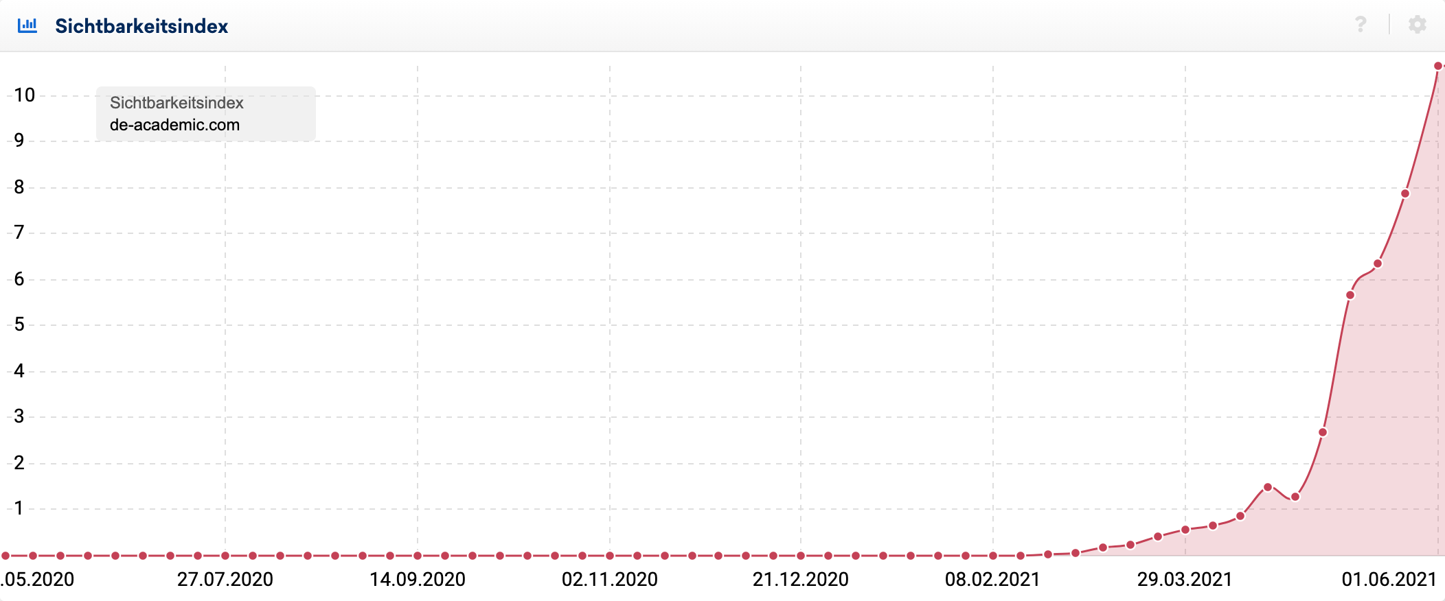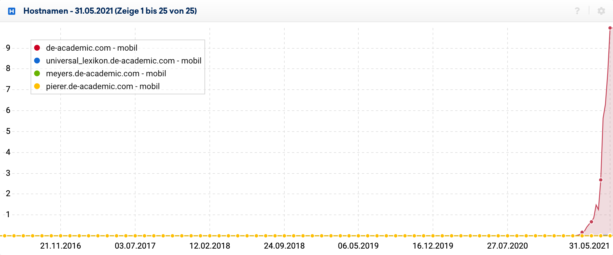 Der größte Gewinner im vergangen Monat ist die Domain de-academic.com. Diese konnte ihre Sichtbarkeit innerhalb von 31 Tagen von 2,3 auf knapp über 10 steigern und damit ein Wachstum von 336% hinlegen. Sieht man sich den Sichtbarkeitsverlauf an, wird einem jedoch schnell klar, dass es sich dabei nicht um eine „normale“ Webseite mit nachhaltiger Optimierung handelt.