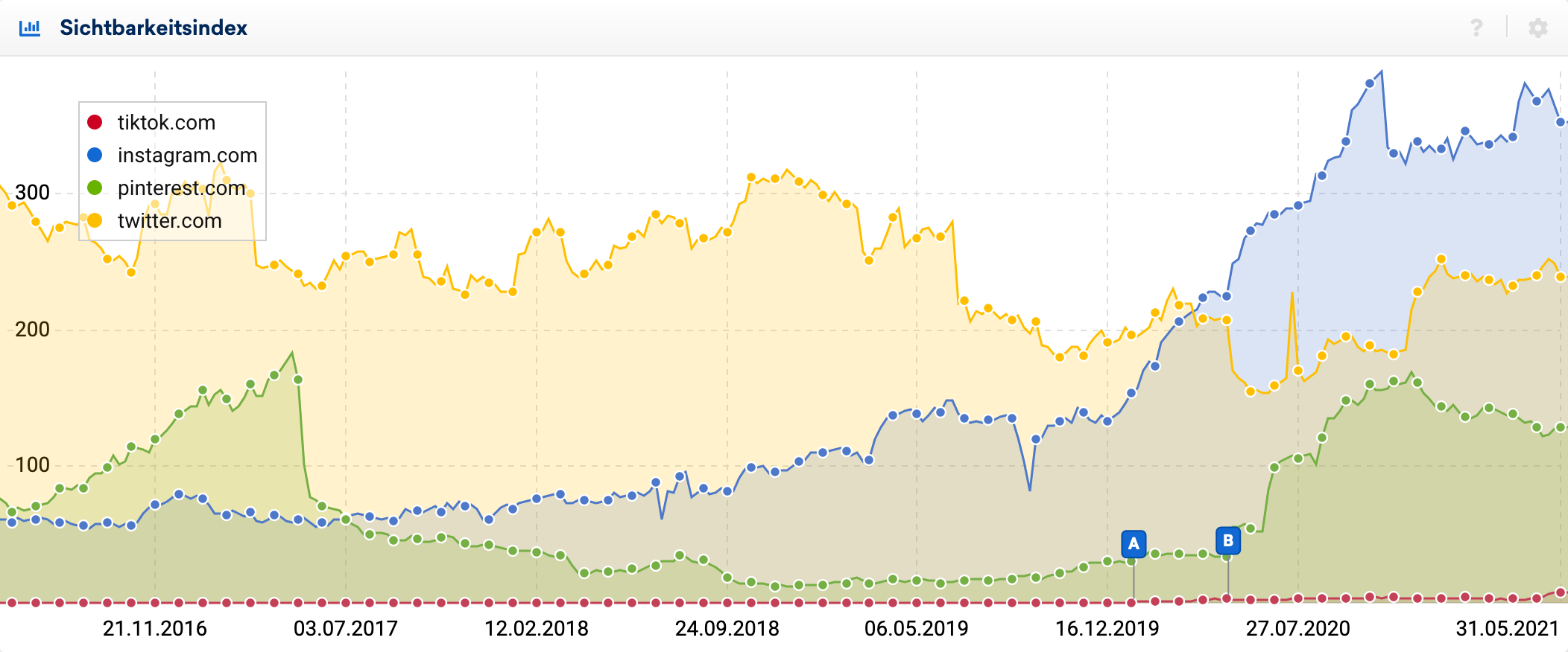Verglichen mit etablierten Social Networks wie pinterest, twitter und instagram wirkt die Sichtbarkeit von TikTok jedoch noch winzig. Mit den Giganten YouTube und facebook habe ich erst garkeiten Vergleich mehr angestellt, denn dann kann man TikToks Sichtbarkeit kaum noch von der x-Achse unterscheiden.
