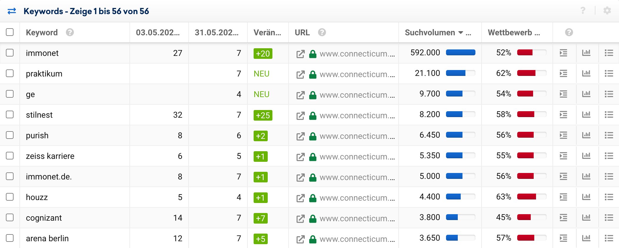 Ebenfalls einen raketenartigen Aufstieg hat die Domain connecticum.de im Mai hingelegt. Die Online-Stellenbörse der Connecticum GmbH, die auch nach eigenen Angaben „eine der weltweit größten Job- und Karrieremessen für Studenten & Absolventen“ veranstaltet konnte ihre Sichtbarkeit innerhalb der letzten vier Wochen vervierfachen: