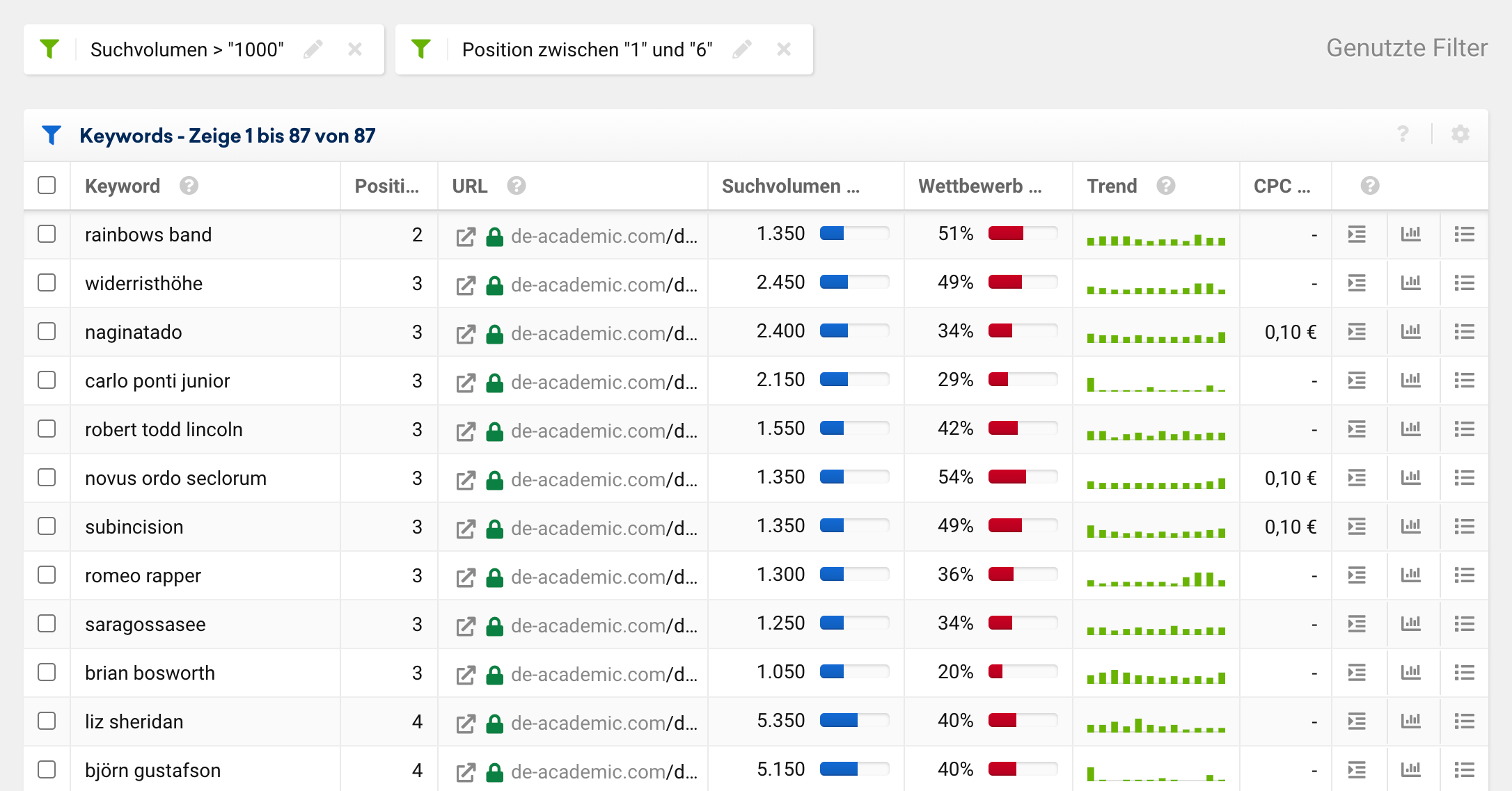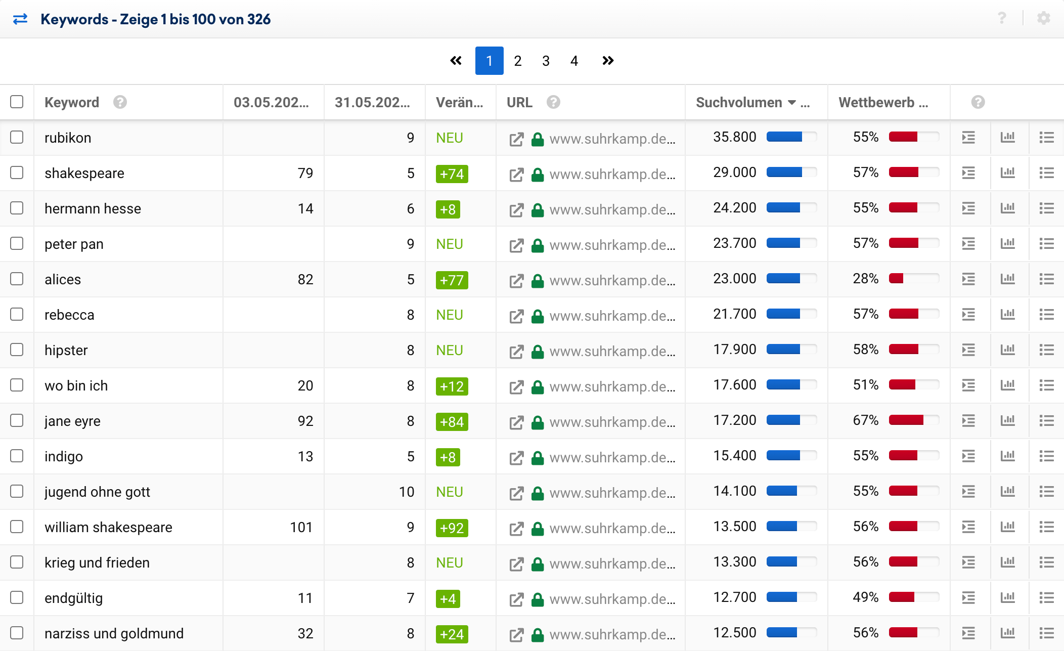 Ein Blick auf die Liste der Gewinner-Keywords in den Top 10, sortiert nach Suchvolumen zeigt viele Autoren und Buchtitel, für die die Domain nun plötzlich hervorragend gerankt wird: