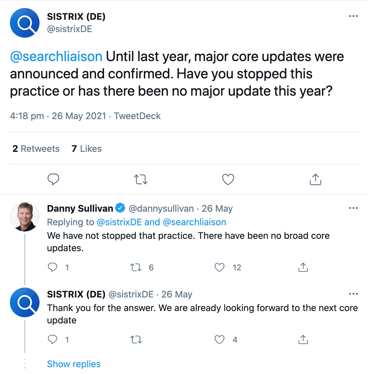 Der Mai war von großen Bewegungen in den Suchergebnissen geprägt und so wurde bereits der Rollout eines weiteren Core Updates vermutet, was von Danny Sullivan auf Twitter jedoch umgehend dementiert wurde: