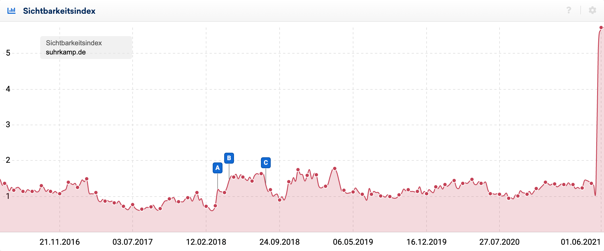 Bereits im letzten IndexWatch vom April konnten wir von einem Gewinner durch einen Relaunch im Online-Büchermarkt berichten. Nun legt offenbar ein Mitbewerber nach, denn die Webseite des Suhrkamp Verlags aus Berlin unter suhrkamp.de konnte nach einem erfolgten Relaunch einen explosionsartigen Anstieg der Sichtbarkeit von etwa 2,2 auf mehr als 5,2 verzeichnen: