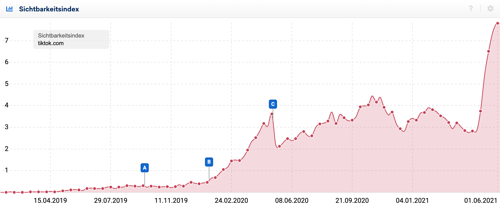 Vom Höchststand im Dezember 2020 von 24,5 aus hat man nun bereits mehr als Dreiviertel der Sichtbarkeit verloren und liegt aktuell nur noch bei knapp über 7 Sichtbarkeitspunkten:
