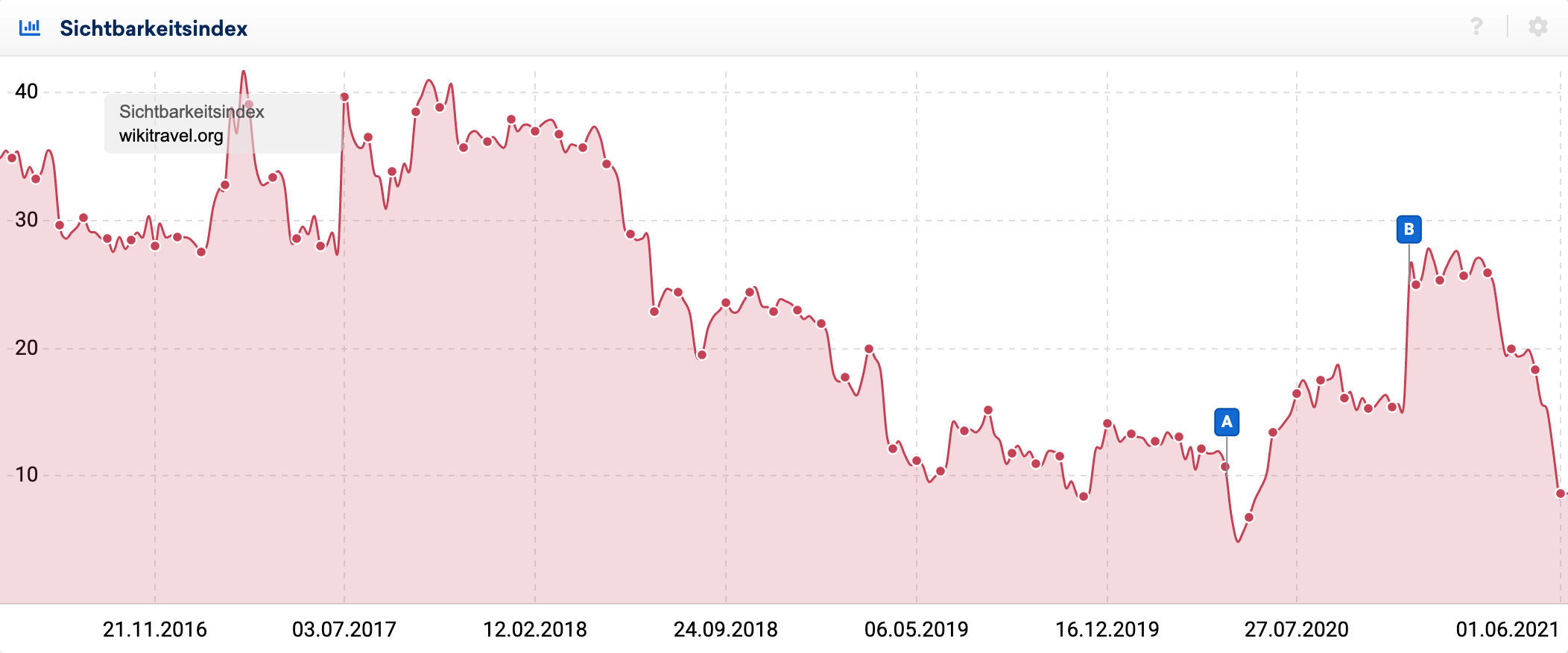 Den freien Reiseführer auf MediaWiki-Basis gibt es bereits seit 2003, was man der Plattform mittlerweile deutlich ansieht und die ganz großen Zeiten von Sichtbarkeiten über 40 sind lange vorbei. Offenbar sind die Nutzersignale nicht mehr gut genug, um die Plattform bei einer Suche nach Ländern und Destinationen innerhalb der ersten 10 Treffer auszuspielen, wie ein Blick in die verloreren Top-Rankings der Domain verrät: