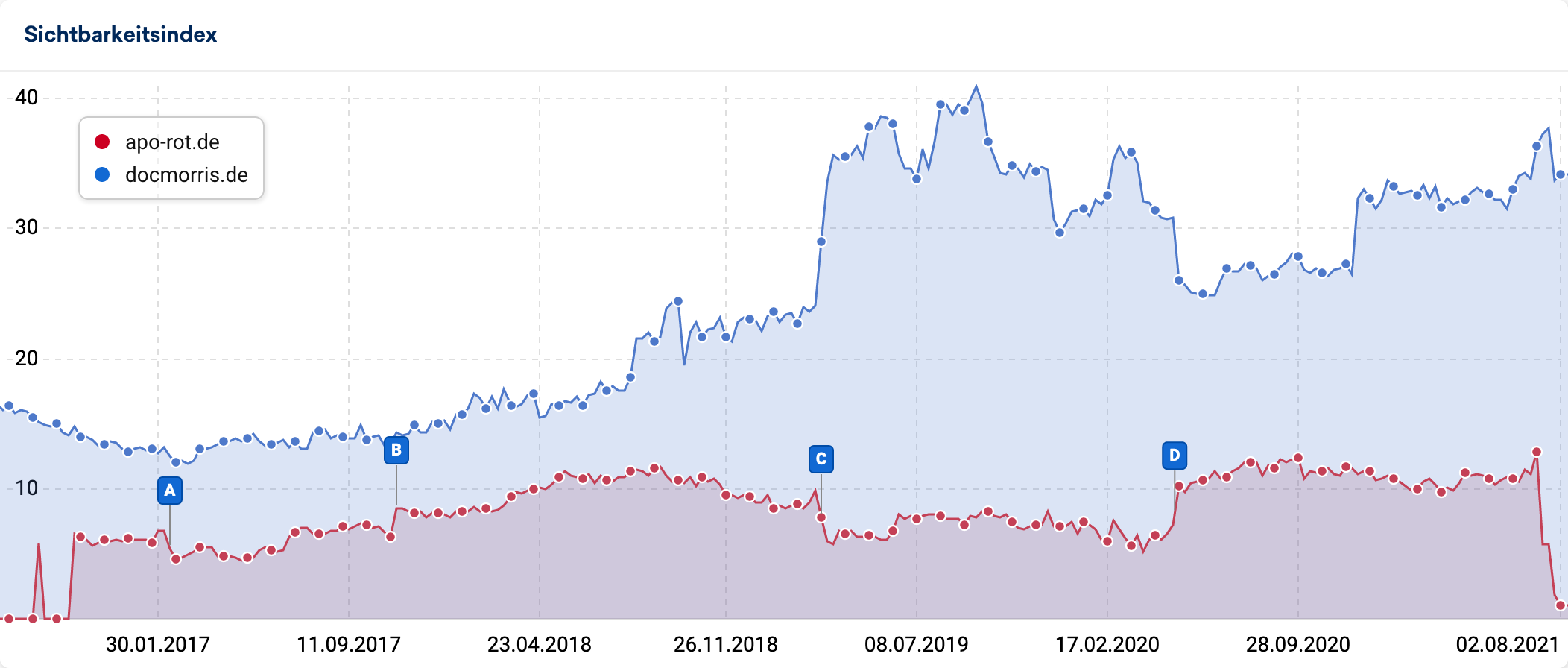 Wie man im Sichtbarkeitsvergleich sehen kann, konnte die Domain docmorris.de bislang noch nicht von der Weiterleitung der Domain apo-rot.de profitieren:
