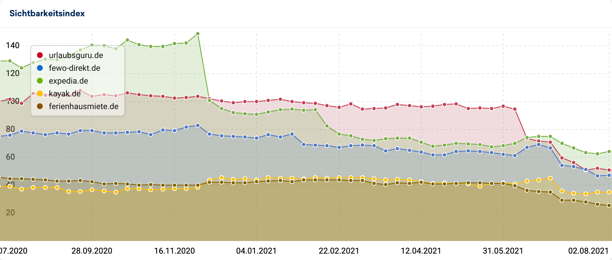 Nach den merkwürdigen Sichtbarkeitsspitzen im Mai sowie den erneuten Ausreißern im Juni, kommt der Reise-Bereich nicht zur Ruhe. Etliche große Plattformen wie urlaubsguru.de, fewo-direkt.de, expedia.de, kayak.de und ferienhausmiete.de müssen aktuell Federn lassen.
