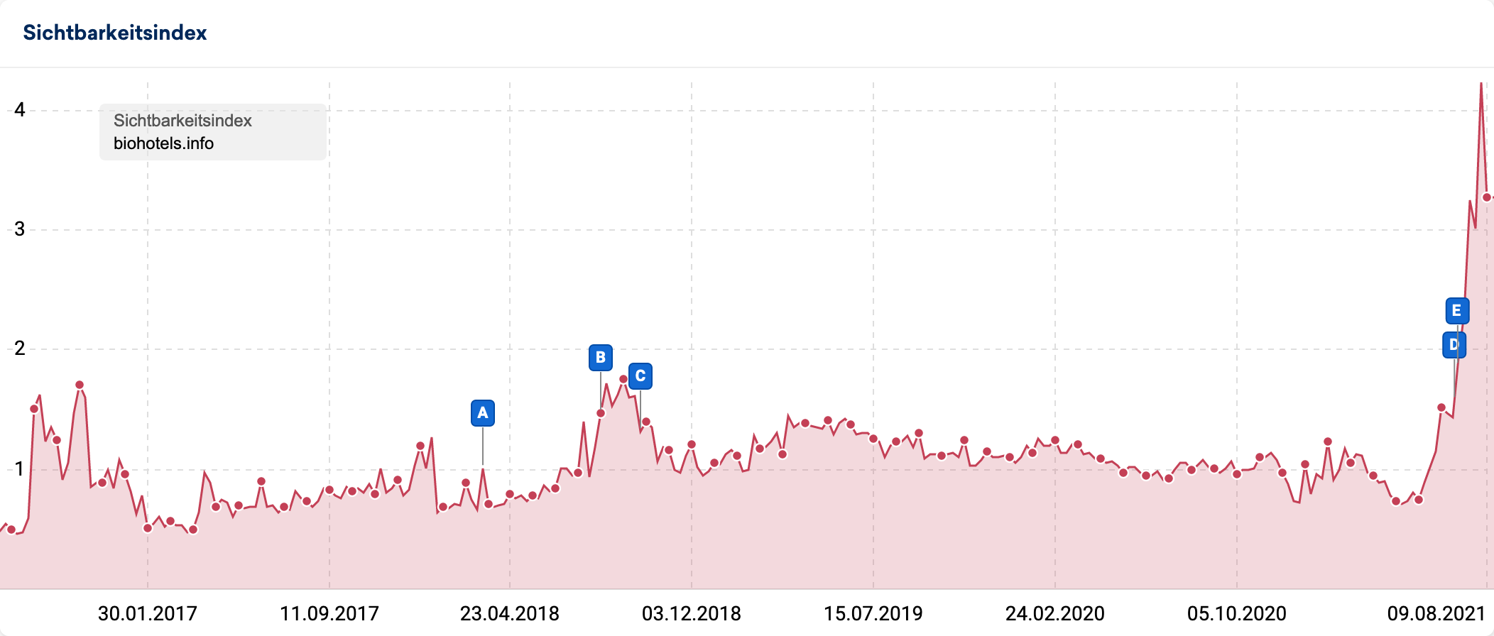 Ein ähnliches Muster kann man bei biohotels.info beobachten, nach eigenen Angaben dem Pioniere des nachhaltigen Tourismus, die es bereits seit 20 Jahren gibt und nun offenbar richtig in den SERPs durchstarten. Die Sichtbarkeit hat sich im letzten Monat fast vervierfacht.