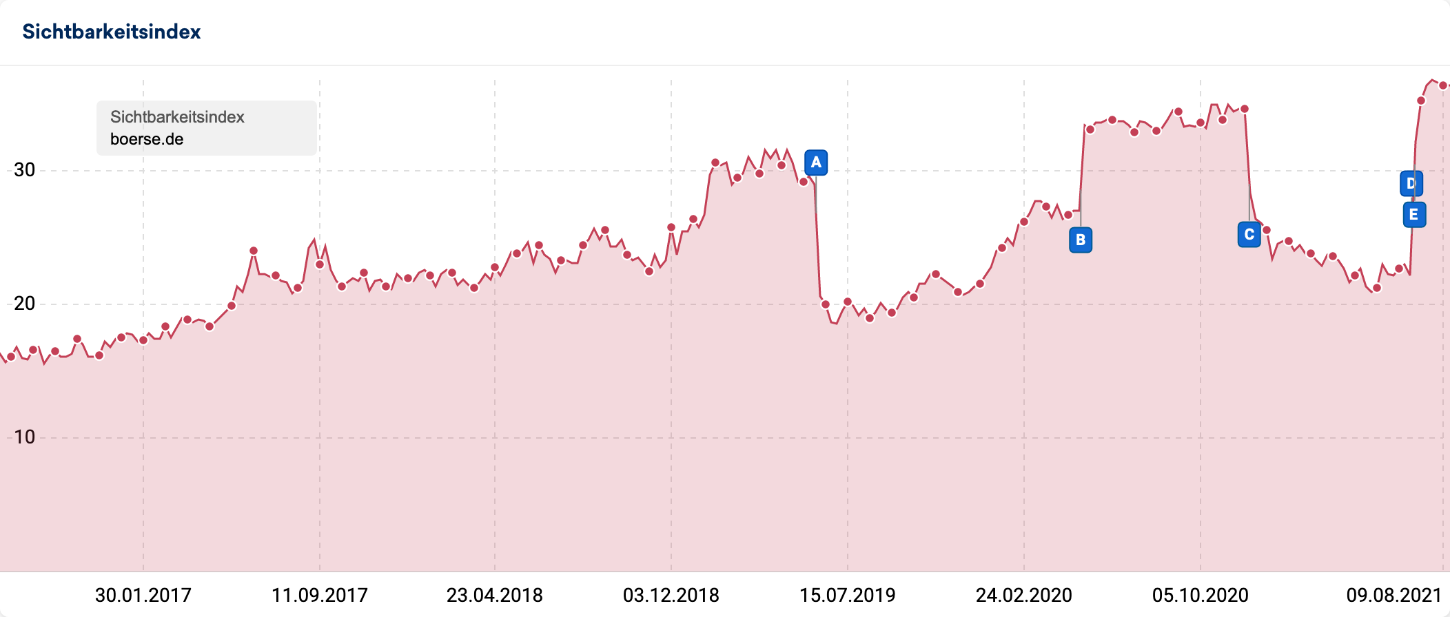 Am ersten Beispiel von boerse.de kann man sehr gut sehen, dass die Domain beinahe bei jedem Core-Update betroffen ist, mal als Gewinner und dann wieder als Verlierer, also offensichtlich gerade an einer Schwelle steht und je nach Daten und Ausprägung eben mal besser oder schlechter bei der Beurteilung weg kommt: