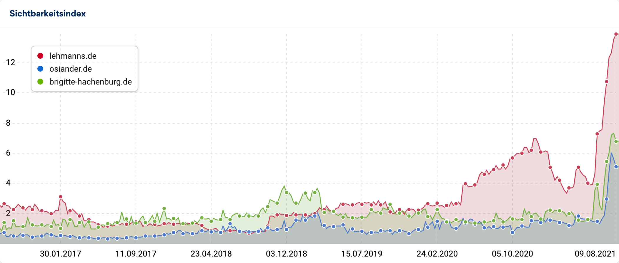 Eine weitere Domain, die einen ähnlichen Zuwachs hinlegen konnte, aber kein klassischer Büchershop ist, ist der Geschenke- und Einrichtungsshop von Brigitte Hachenburg. Hier habe ich bei einer Kurzanalyse keinen offensichtlichen Grund für die Sichbarkeitsexplosion ausfindig machen können.