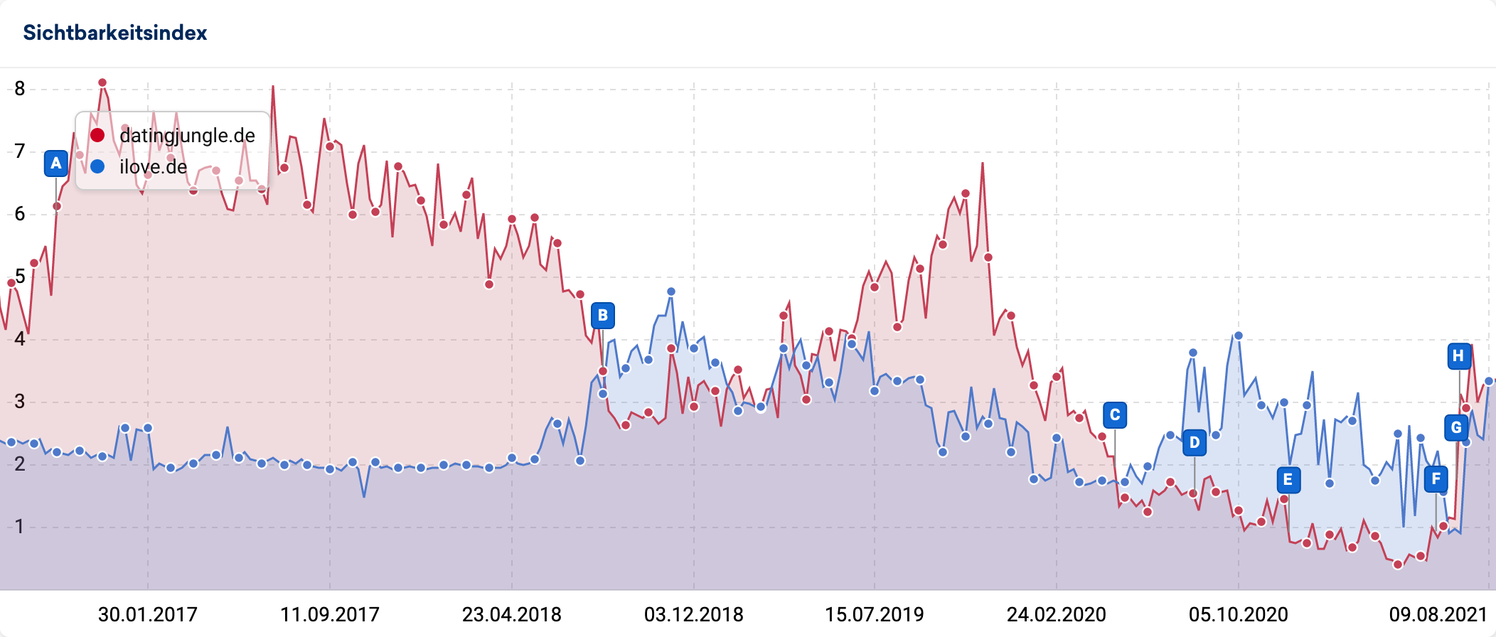 Derartige gemeinsame Bewegungen mehrerer Domains in einem Segment, deuten in der Regel auf eine Verschiebung der angenommenen Nutzerintention auf vielen Suchanfragen gleichzeitig oder auf eine Veränderung der Gewichtung dieser Seitentypen hin.