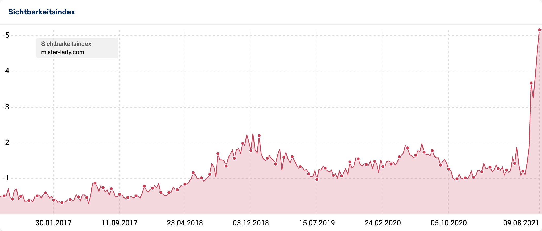 Auf den ersten Blick deutlich nachhaltiger scheint derzeit offenbar die Webseite von mister*lady zu wachsen. Diese Domain kenne ich noch aus meiner Agentur-Zeit und scheinbar zahlt sich nun die Arbeit der letzten Jahre endlich aus. Die Domain mister-lady.com hat sich mehr als vervierfacht und explodiert förmlich in Sachen Sichtbarkeit: