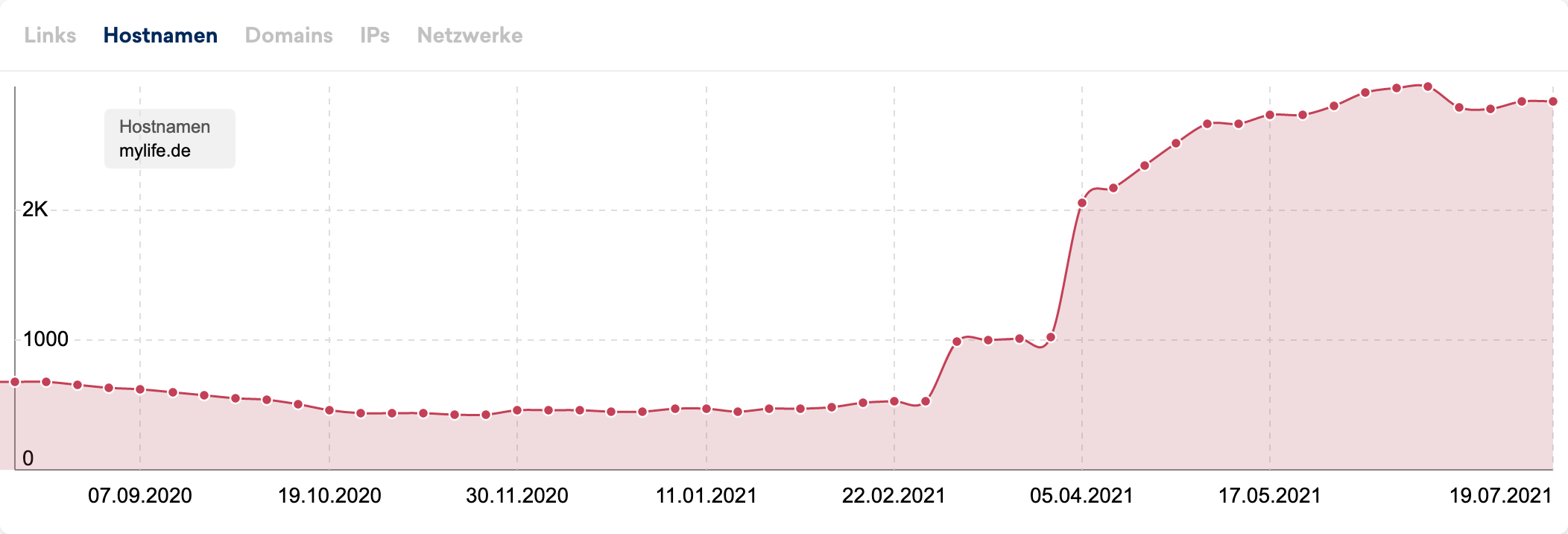 Ein Blick auf die Entwicklung der Backlinks (die Anzahl der verlinkenden Hostnamen von mylife.de im Verlauf) legt allerdings noch einen andern Verdacht nahe: Hat hier jemand etwa Links aufgebaut und nun davon profitiert?