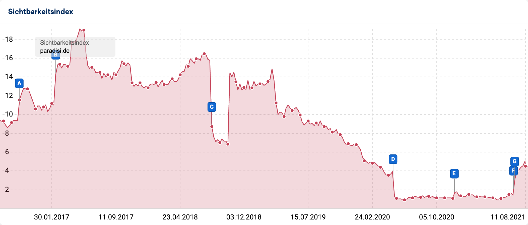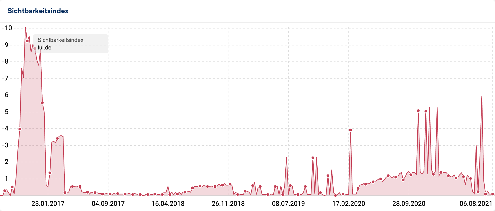 Ohne einen Blick auf die Search Console oder Logfiles werfen zu können, kann ich nicht nachvollziehen, wieso die Domain tui.de überhaupt eine Sichtbarkeit von 6,7 hatte, die sie nun fast vollständig abgegeben hat (-99%).
