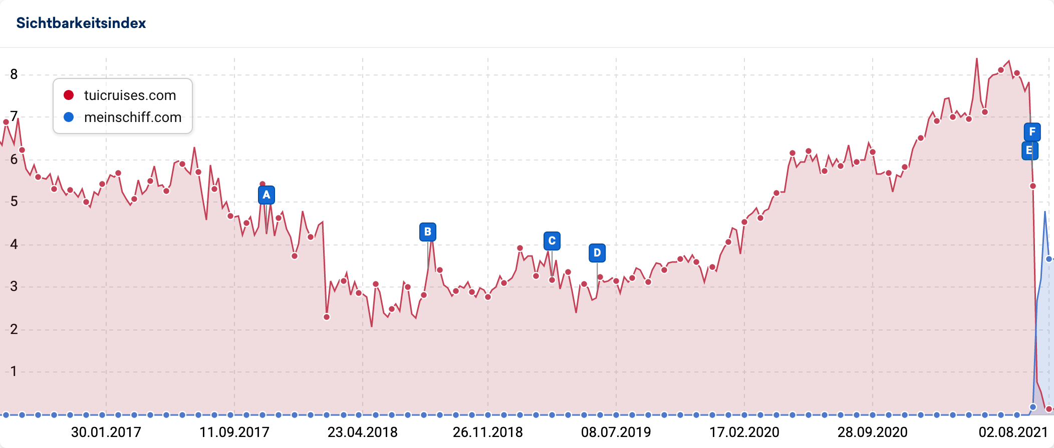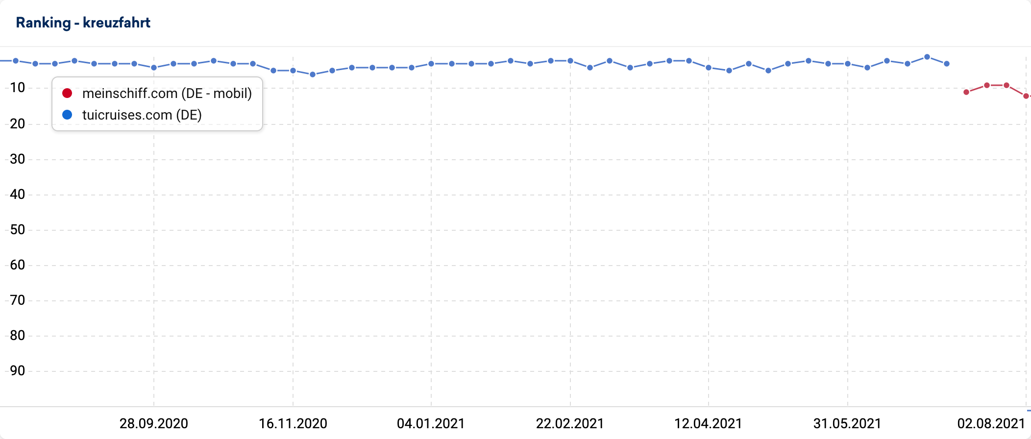 Die TUI Cruises GmbH ist ein Joint Venture der TUI AG und der Royal Caribbean Cruises Ltd. und Eigner der Kreuzfahrtschiffe „Mein Schiff“. Offenbar entschied man sich „Mein Schiff“ als stärkste Marke nach außen auch online zu nutzen, denn Anfang Juli wurde tuicruises.com auf meinschiff.com weitergeleitet, wobei jedoch fast 50% der Sichtbarkeit verloren ging: