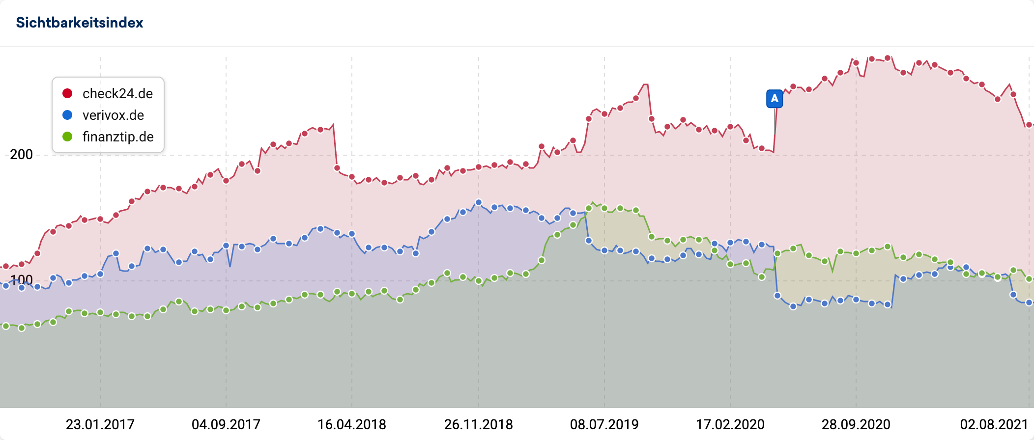 Sieht man sich die Sichtbarkeitsverläufe einiger großer Vergleichsseiten an, erkennt man einige parallele Bewegungen, bei denen Domains gemeinsam verlieren, aber auch entgegen gesetzte Verläufe, bei denen eine Domain auf Kosten einer anderen wächst. Im Juli haben nun alle großen Vergleicher gemeinsam an Sichtbarkeit eingebüßt.