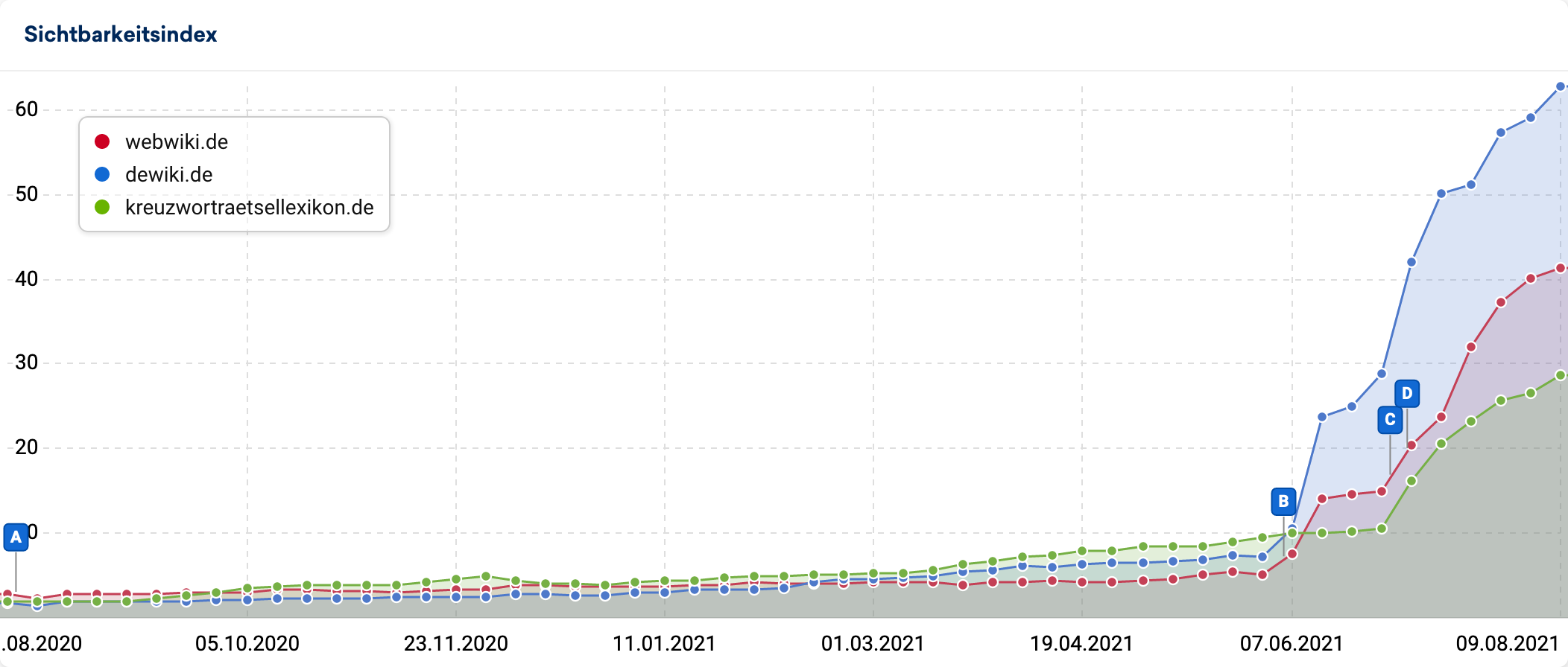 Der Aufstieg der Wiki-Klone geht weiter. Domains wie webwiko.de und dewiki.de gewinnen weiter rasant an Sichtbarkeit und auch Lexika wie kreuzwortraesellexikon.de wachsen weiterhin auf Kosten der etablierten Wörterbücher.