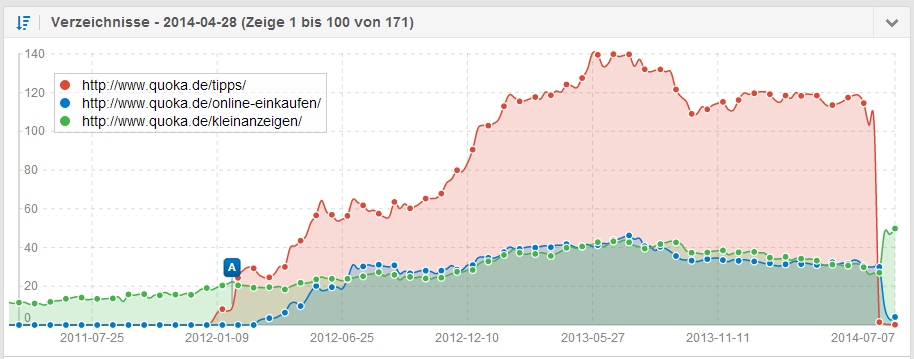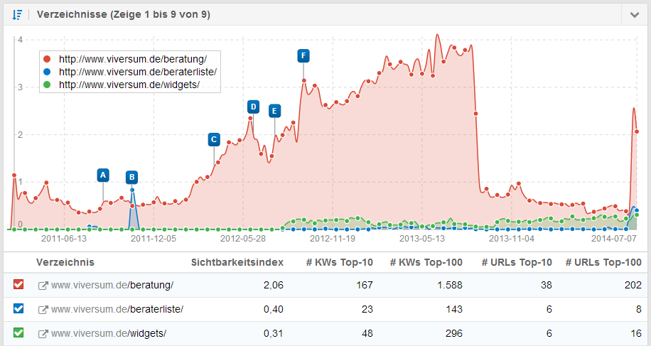 Ein Blick auf die Verzeichnisse der Domain zeigt uns, welche am stärksten zur Sichtbarkeit beitragen. Deutlich zu erkennen, das Beratungs-Verzeichnis verlor damals massiv an Sichtbarkeit, wohingegen die anderen Verzeichnisse nahezu unberührt blieben. Jetzt erstarkte das Beratungs-Verzeichnis zusammen mit der Beraterliste und dem Widgets-Verzeichnis.