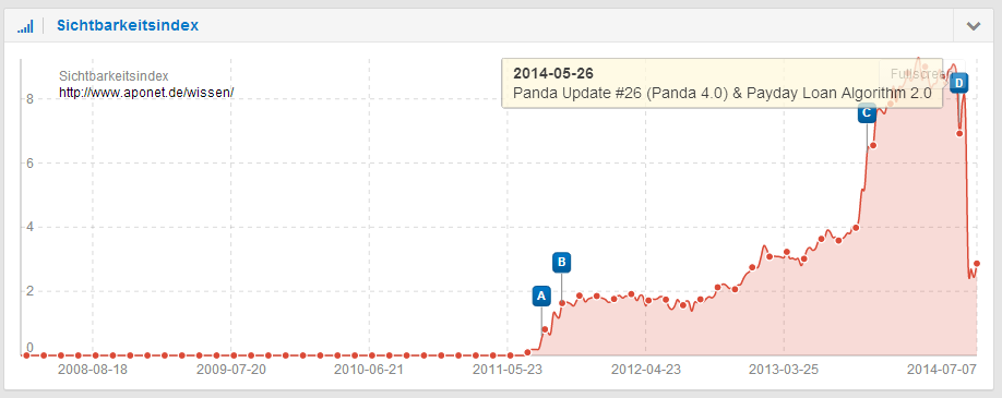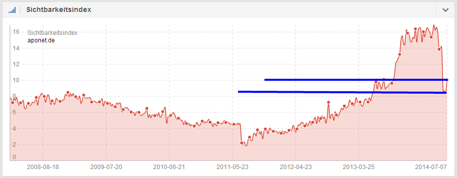 Vermutlich wurde das Wissen-Verzeichnis vom Panda-Filter erfasst. Dies würde zumindest den Verlauf des SISTRIX Sichtbarkeitsindex von aponet.de erklären, in welchen ich oben zwei blaue Linien eingezeichnet habe. Der drastische Zuwachs in der Sichtbarkeit ist nahezu deckungsgleich mit dem Zeitpunkt der Erstärkung des Ratgeber-Verzeichnis /wissen/. Für eine algorithmische Penalty spricht hier, dass Google die Sichtbarkeit der Domain aponet.de nach Abstrafung des Verzeichnis /wissen/ wieder auf das „natürliche Ausgangs-Niveau“, markiert durch die beiden blauen Linien, gesenkt hat.