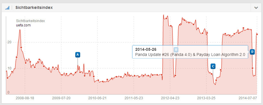 In unserem vergangenen IndexWatch der Ausgabe 06/2014 war die Domain uefa.com mit einem Minus von mehr als 70% im SISTRIX Sichtbarkeitsindex der größte Verlierer auf dem deutschen Suchmarkt.