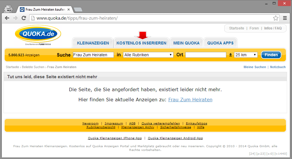 Scheinbar hat man bei Quoka das Tipps-Verzeichnis gelöscht und präsentiert dem User fortan eine 404-Fehlerseite. Schade, aber immerhin verweist man passend auf geschaltete Kleinanzeigen zu dem gesuchten Thema.