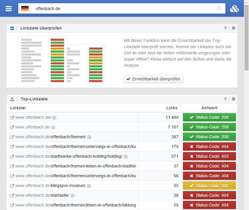 Auch die Backlinks einer Website, welche noch immer zu einem stark gewichteten Rankingfaktor zählen, leiden unter dieser nicht getroffenen Maßnahme. Eine Erreichbarkeitsprüfung der Top-Linkziele der Domain offenbach.de im Link-Modul fördert schreckliches zu Tage: