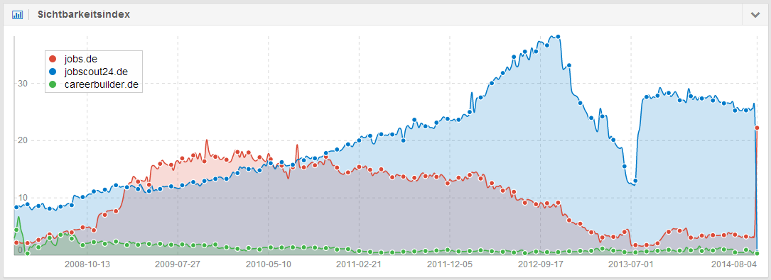 Alle drei in der Grafik dargestellten Domains haben eine Geschichte. JobScout24 übernahm im Oktober 2004 die Domain Jobs.de und wandelte diese in eine Jobsuchmaschine um. Im September 2011 gab CarrerBuilder bekannt, JobScout24 zu akqurieren. Im Februar diesen Jahres gab man dann noch bekannt, dass JobScout24 die stärkste Marke unter den klassischen Jobbörsen sei. Aufgrund dieser Markenbekanntheit und der entsprechend guten SEO-Performance der Domain JobScout24, ist eine Weiterleitung auf die Domain Jobs.de doch eher verwunderlich. Wobei Jobs.de die natürlich schönere Domain darstellt.