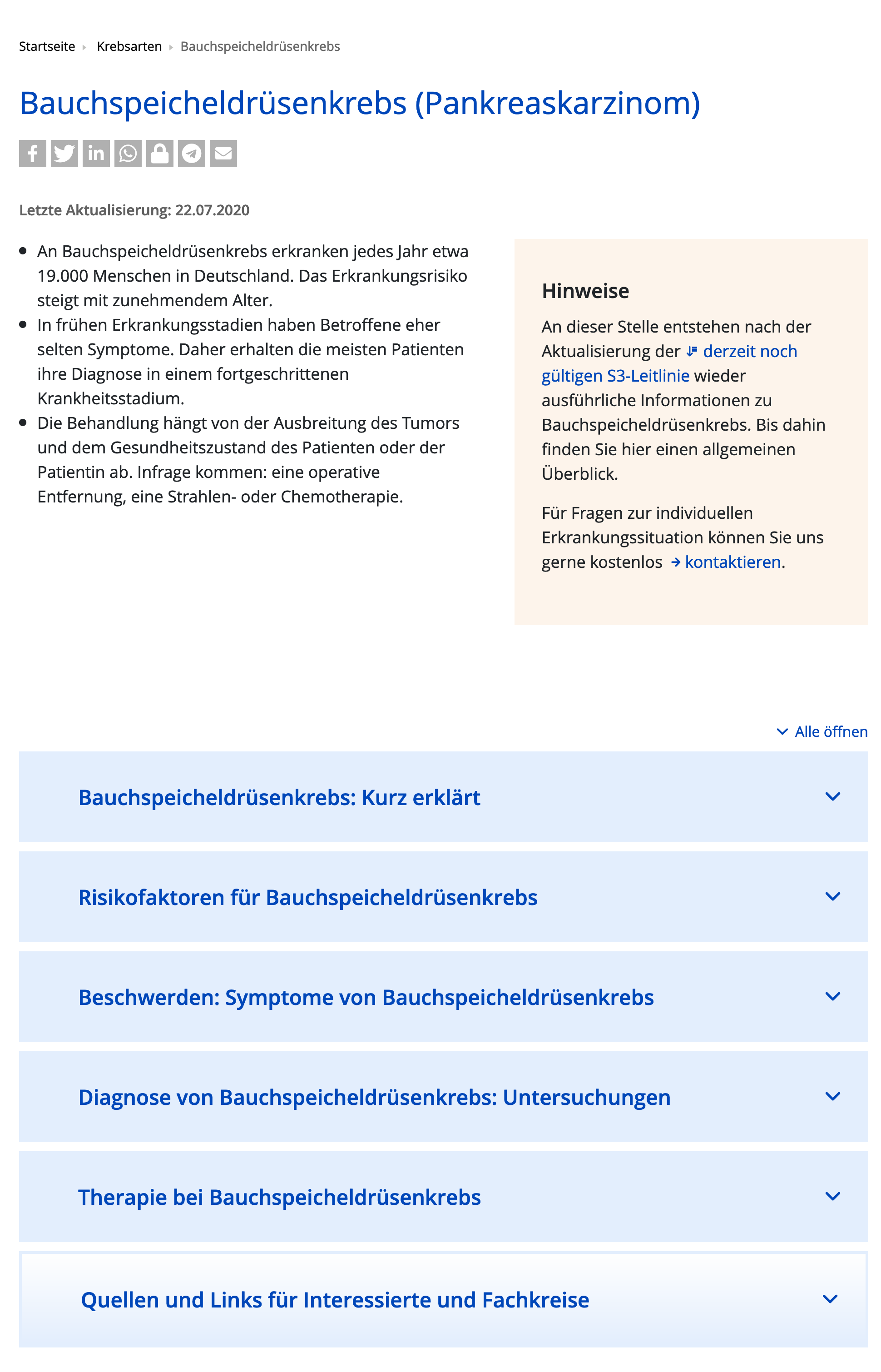 Ich tippe auf Ersteres, denn im Gegensatz zu den Seiten, die nun ganz vorne stehen, gibt es auf der Webseite des Krebsinformationsdienstes einen entscheidenden Unterschied: Um an Informationen zu gelangen, die über eine kurze Einleitung hinaus gehen, muss der Nutzer das Akkordion nutzen und mehrfach den nächsten Abschnitt öffnen, bevor dieser den Inhalt konsumieren kann: