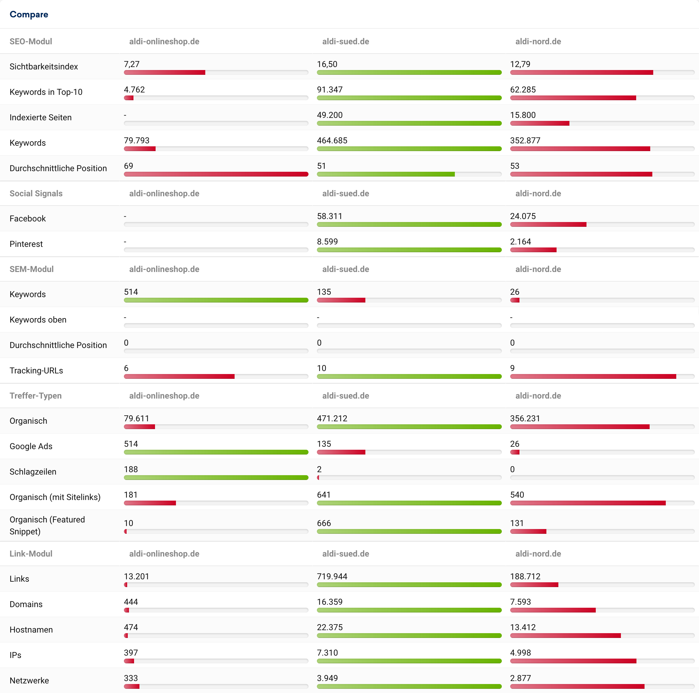 Besonders spannend finde ich den Sichtbarkeitsgewinn angesichts der Tatsache, dass die Domain im Vergleich mit den beiden Domains der Filial-Holdings aldi-sued.de und aldi-nord.de kaum Backlinks und Social Signals aufweist: