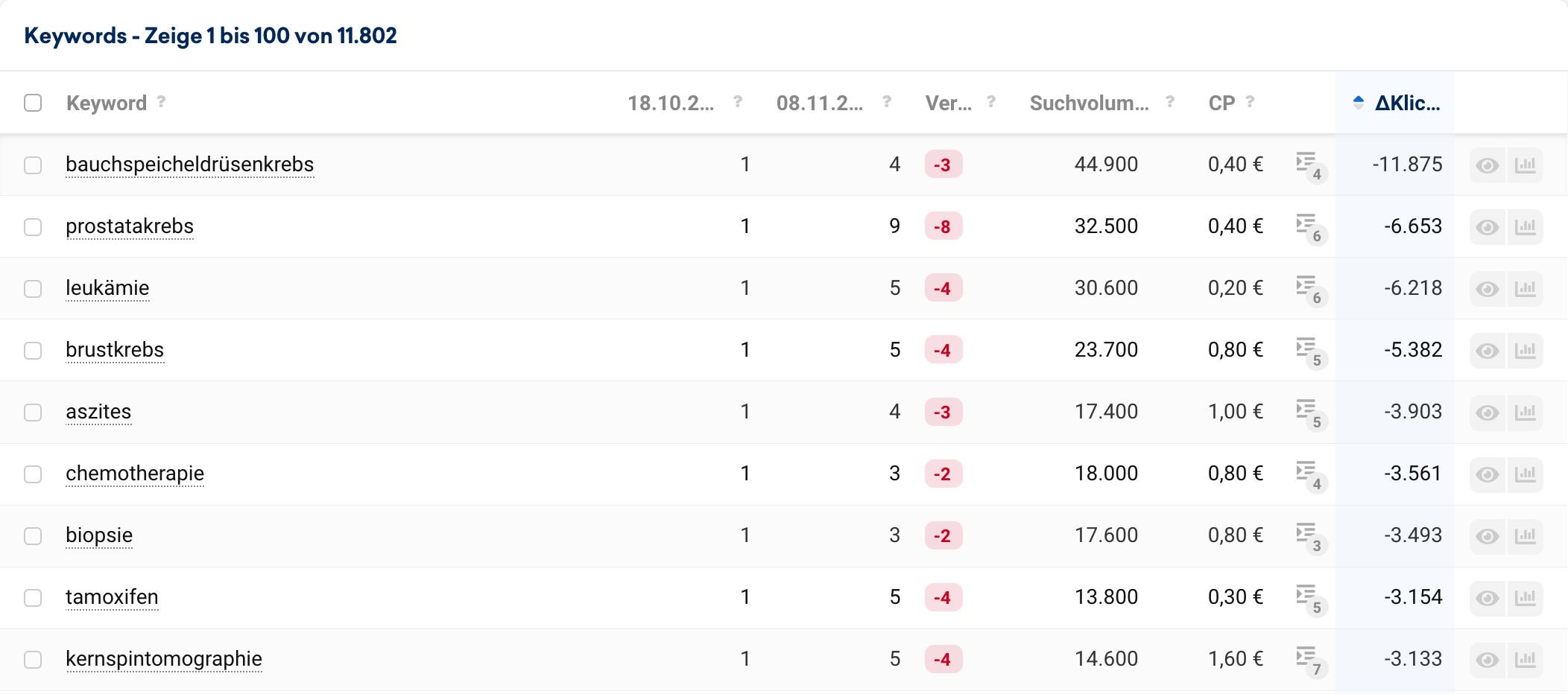 Ganz oben stehen nur Keywords, von sehr allgemeinen Suchanfragen nach Krebsarten, Symptomen, Diagnose- und Behandlungsmöglichkeiten, bei denen die Domain innerhalb der Top 10 zurückgestuft oder auch auf die zweite oder Dritte Ergebnisseite abgerutscht ist. Es gibt kaum Totalausfälle, außer beim Keyword „moringa“ und „kurkuma“.