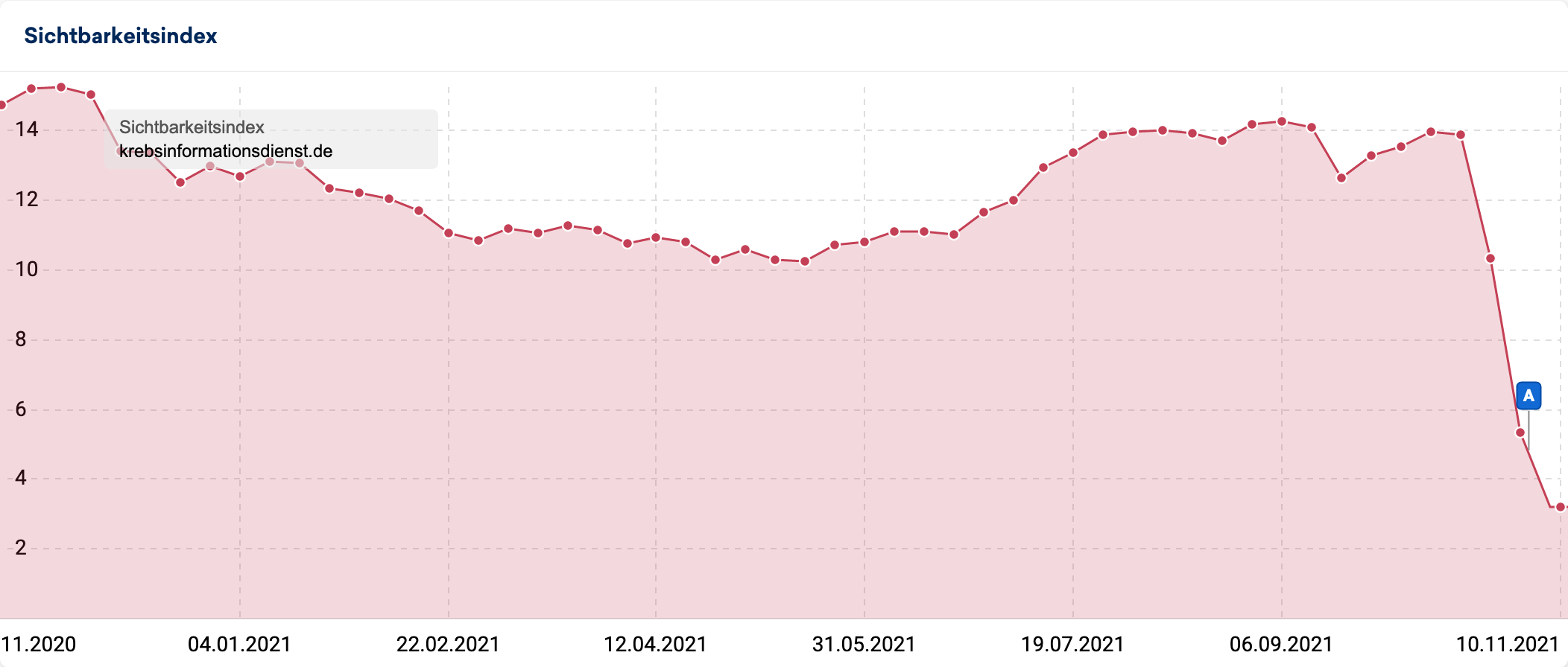 In der zweiten Oktoberhälfte sank die Sichtbarkeit der Domain von 11,7 auf 5,2, was bereits 56% der Sichtbarkeit vernichtete, jedoch ging es Anfang November weiter nach unten, auf derzeit nur noch knapp über 3 Sichtbarkeitspunkten: