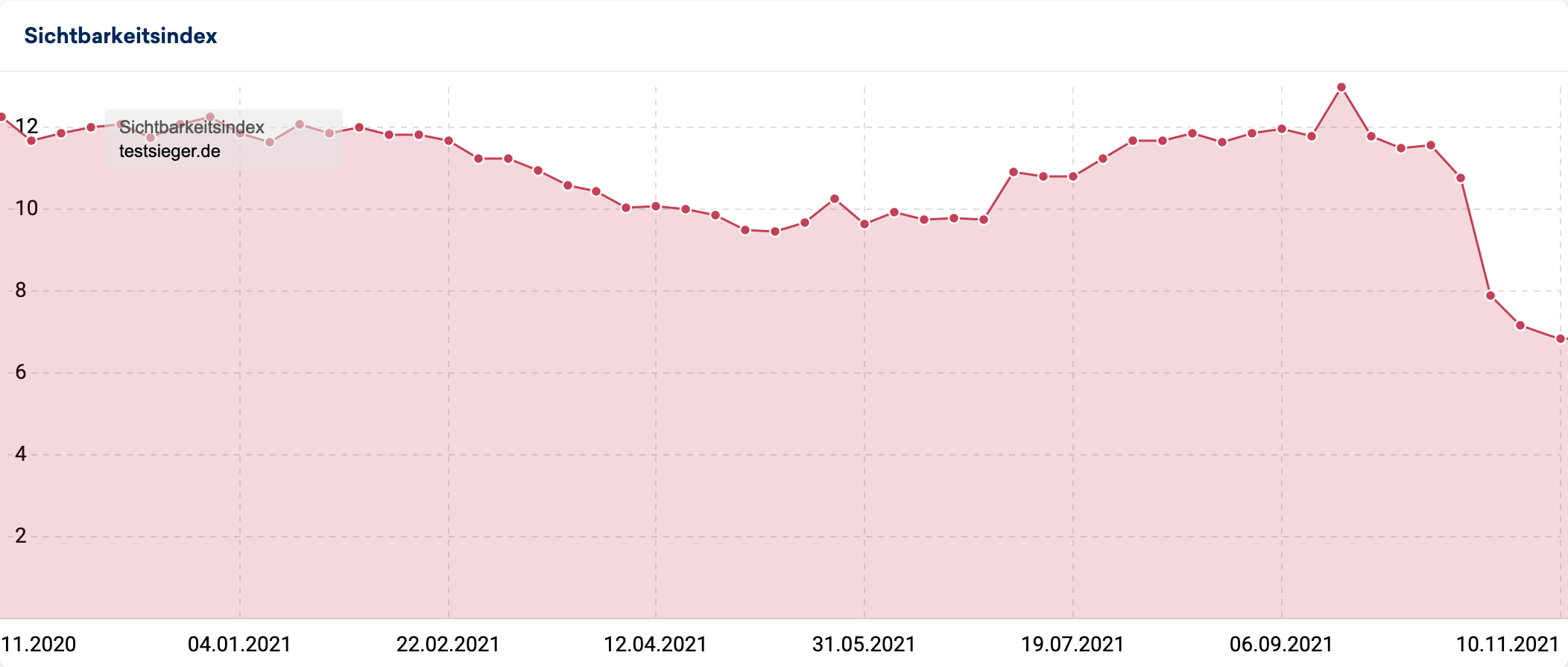 Die Domain testsieger.de verlor im Oktober mehr als 40% ihrer Sichtbarkeit (von 12,3 auf 7,4) und scheint sich dort nun zu fangen: