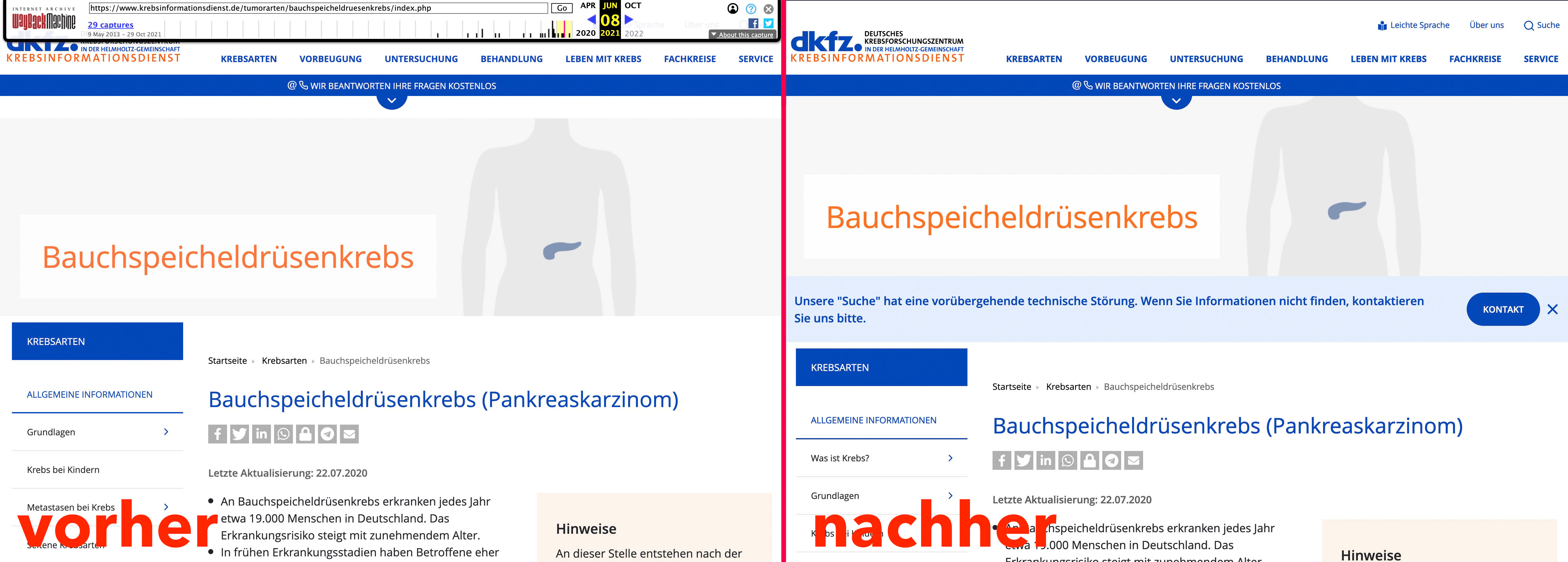 Vergleichen wir einmal die Unterseite /tumorarten/bauchspeicheldruesenkrebs/index.php, die vor kurzem noch unangefochten auf Platz 1 zum Keyword „Bauchspeicheldrüsenkrebs“ stand mit einer älteren Version vor dem Verlust über die Wayback Machine, fällt eine Änderung auf: