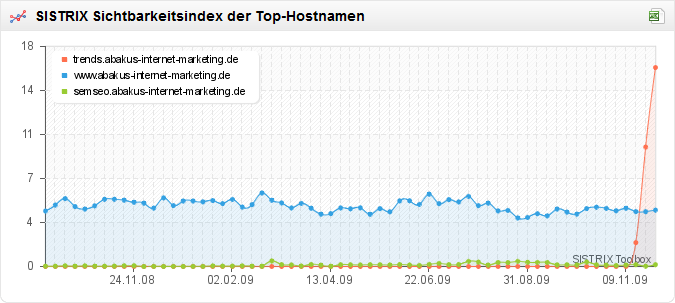 Endlich haben wir auch mal eine bekannte Domain aus dem SEO-Umfeld dabei: Abakus hat es durch Einsatz einer Subdomain in den letzten 4 Wochen geschafft, deutlich an Sichtbarkeit in den Google-SERPs zu gewinnen. Spannend ist jetzt die Frage, ob die Auflistung von „Keyword-Trends“ ausreichend Mehrwert liefert, um weiterhin bei Google gelistet zu werden.