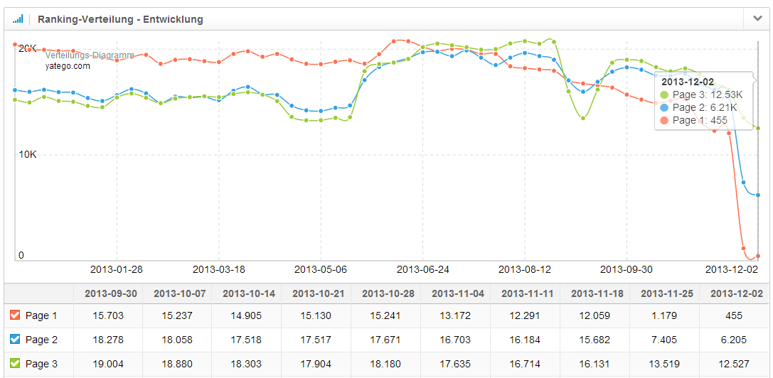 Die Online-Shoppingmall yatego.com muss ein Minus von 76% in Ihrer Sichtbarkeit verzeichnen. Wirft man einen Blick auf die absoluten Zahlen der Ranking-Verteilung, so hatte die Domain Ende September noch etwas über 15.000 Rankings auf der ersten Suchergebnisseite. Ende November waren es nur noch knapp 1.200 und in der ersten Dezemberwoche sind es lediglich 455.