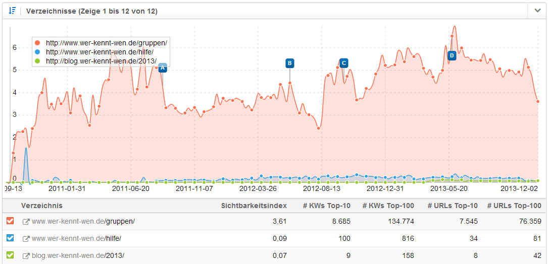 wer-kennt-wen.de, seines Zeichens das größte deutsche soziale Netzwerk, erfuhr gegen Ende Oktober einen Relaunch. Zur technologischen Innovation wird in einer Pressemeldung des Unternehmens das Responsive Webdesign angeführt. Die Sichtbarkeit der Domain sank im folgenden Monat November um 16%. Ein Blick auf die Verzeichnisse mit der größten Sichtbarkeit zeigt, dass der Verlust zu großen Stücken auf /gruppen/ zurückzuführen ist – hier wird bei Aufruf ein HTTP-Statuscode 404 ausgegeben.