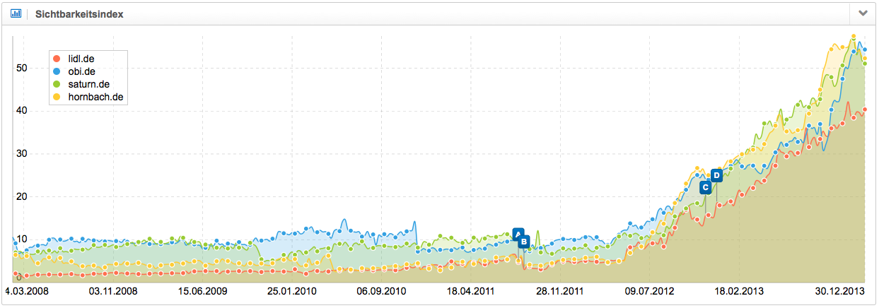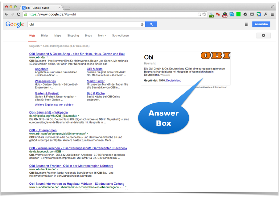 Insgesamt findet man viele starke Marken unter den Gewinner-Domains. Noch deutlicher zeigt sich dieser Trend, wenn man die Auswertung auf die 100 größten Gewinner ausweitet. Dabei zeigen die Sichtbarkeitsverläufe vieler Domains einen auffällig ähnlichen Verlauf. Als Beispiel wurden in dieser Grafik die Verläufe von lidl.de (Platz 33), obi.de (53), saturn.de (54) und hornbach.de (67) verglichen. Alle diese Domains zeigen nach einem jahrelangen Seitwärtstrend seit etwa Ende Mai 2012 einen starken Aufwärtstrend, der sich 2013 kontinuierlich fortsetzte. Für alle diese Domains wird bei einer Suche nach der Marke eine Answer-Box über den Google Knowledge Graph angezeigt. Und wir erinnern uns, dass Google den Knowledge Graph im Mai 2012 eingeführt hat (Englisch, Deutsch).