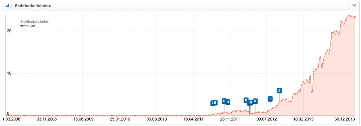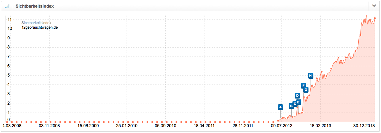 Unerwähnt sollen auch nicht relativ junge Websites wie wimdu.de (2), kartenmacherei.de (5) und 12gebrauchtwagen.de (10) bleiben. Sie haben ihren Erfolgskurs deutlich und weitestgehend stabil fortgesetzt. Inzwischen haben sie Größenordnungen erreicht, um als willkommene Alternativen für bekannte SEO-Fallstudien wie z.B. zalando.de herangezogen werden zu können. Ein tieferer Einblick in die eingesetzten SEO-Techniken ist sicherlich mehr als nur einen Blick wert.