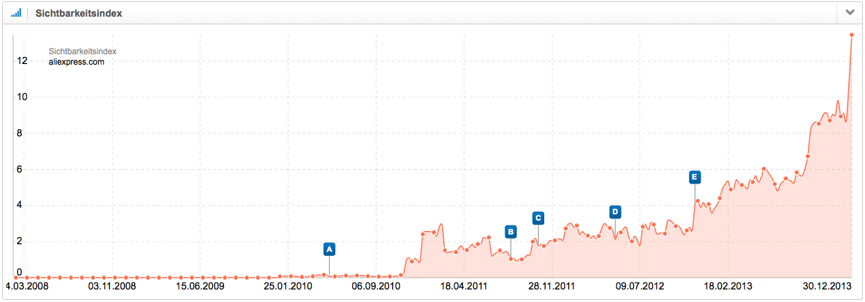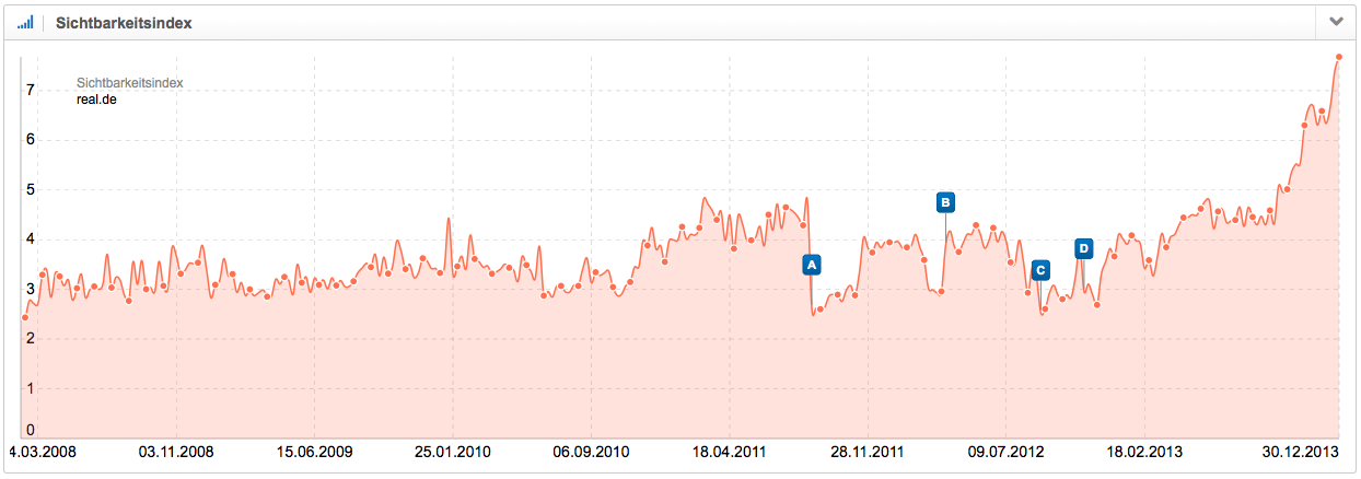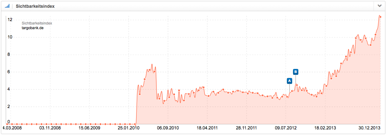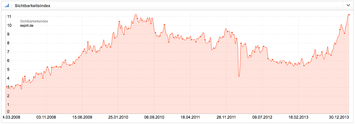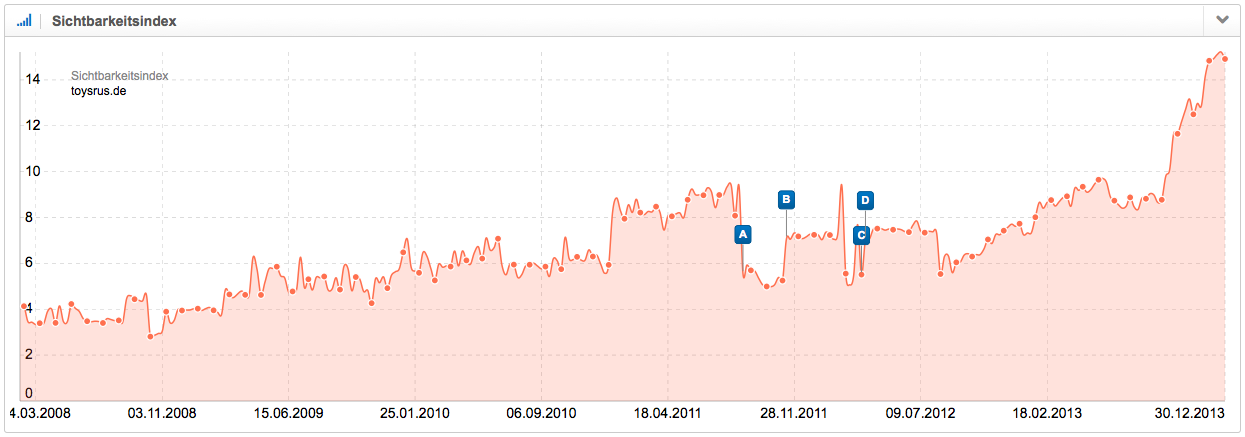 Bei anderen Marken wie beispielsweise targobank.de (4), reichelt.de (9), lexware.de (23) real.de (46), esprit.de (71), toysrus.de (78) und oetker.de (83) setzen die starken Aufwärtstrends zum Teil später ein. So bleibt Raum für Spekulationen und es wird sich nicht vermeiden lassen, die Einzelfälle tiefergehend zu analysieren, zu differenzieren und dabei besondere Ereignisse wie einen Relaunch und aktiv durchgeführte SEO-Maßnahmen zu berücksichtigen.