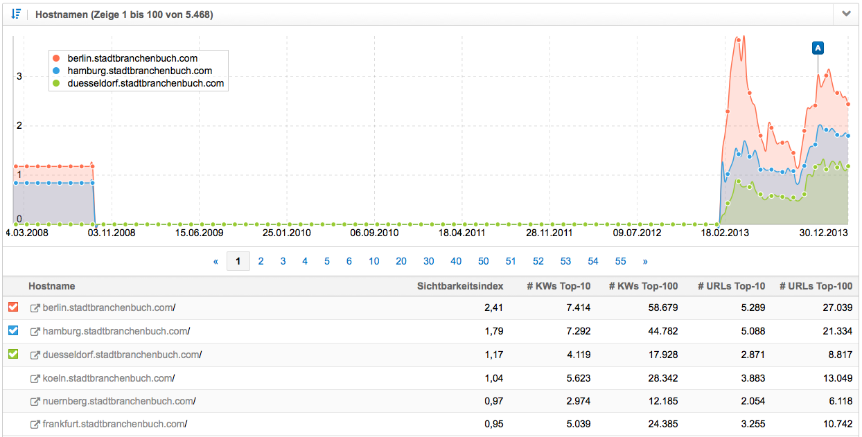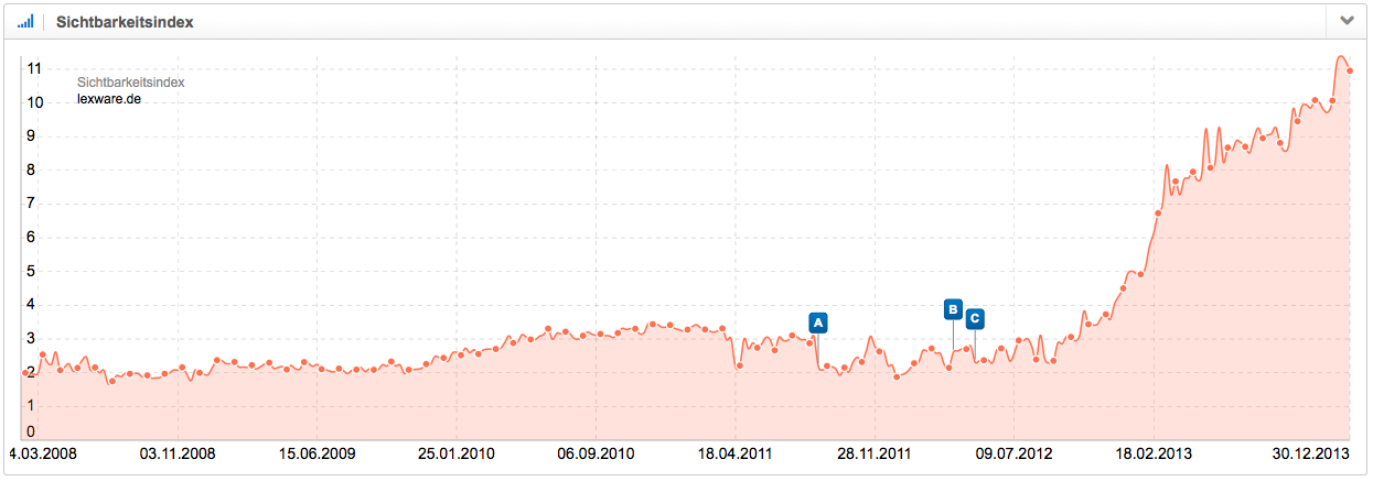 Insgesamt fiel bei der Auswertung auf, dass Google deutlich selektiver geworden ist, welchen Domains mehr Sichtbarkeit eingeräumt wird. Fand man in den letzen Jahren unter den Gewinnern immer einige reinrassige Spamprojekte, so hatten die Gewinner 2013 im Schnitt qualitativ deutlich mehr Substanz. Offenbar setzt Google stärker auf langfristiges Vertrauen und Nutzersignale. Wir haben uns daher auch erstmals entschlossen, keine Domains, z.B. aufgrund von Domainumzügen oder kurzfristigen Penalties, aus der Liste zu streichen. Über den Zeitraum von einem Jahr sorgt Google inzwischen selbst für ein großes Maß an qualitativer Hygiene.